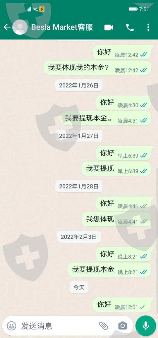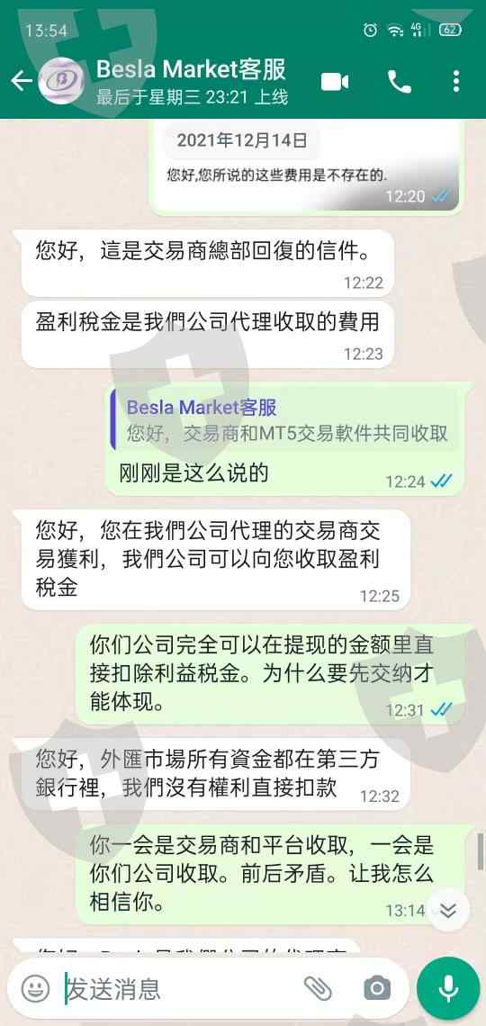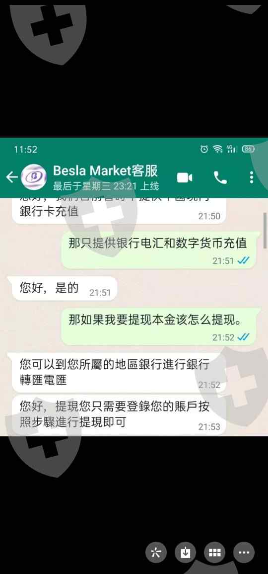Besla market ltd是家黑平台,公司和员工相互合作。冲值后不让出金。出金马上冻结账号。各种理由要求缴纳费用。客服也不回信息