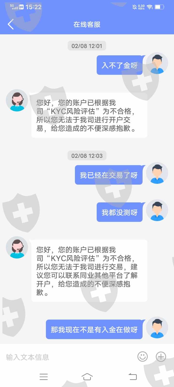 刚入金做到第五天就入不了金,多次联系客服,一直未解决,后面说我有个KYC不合格,那为什么不是开户时就让证的吗,我是正常每天做单,又没做别的,难道要我入了的损完亏到没法入金,亏完为止吗?太不负责任了,问这个风险是以什么认证的也不回答