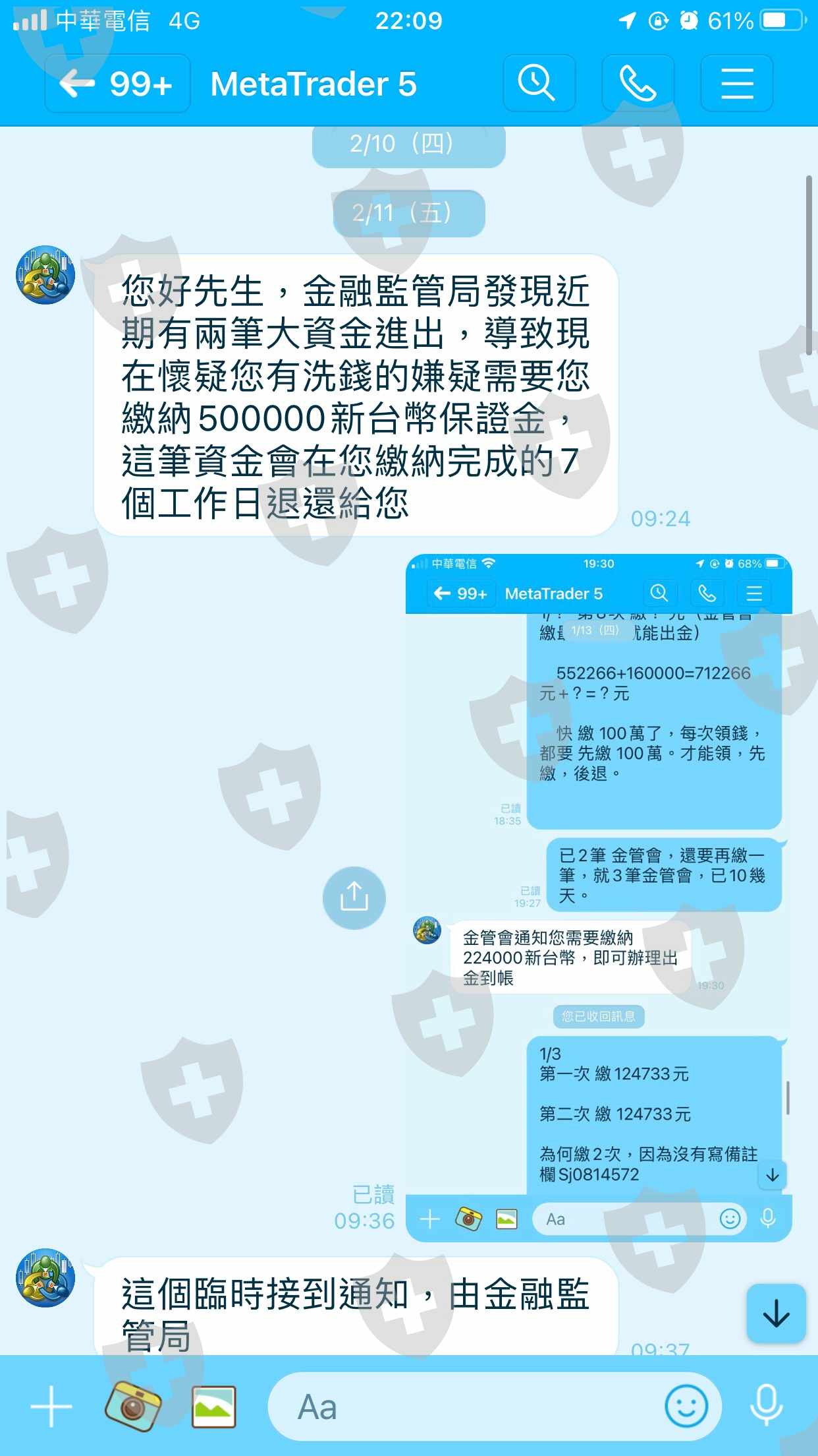 上星期五還要我再繳一筆500000元(您好先生,金融監管局發現近期有兩筆大資金進出,導致現在懷疑您有洗錢的嫌疑需要您繳納500000新台幣保證金,這筆資金會在您繳納完成的7個工作日退還給您)。這筆50萬元沒繳,直接報案。