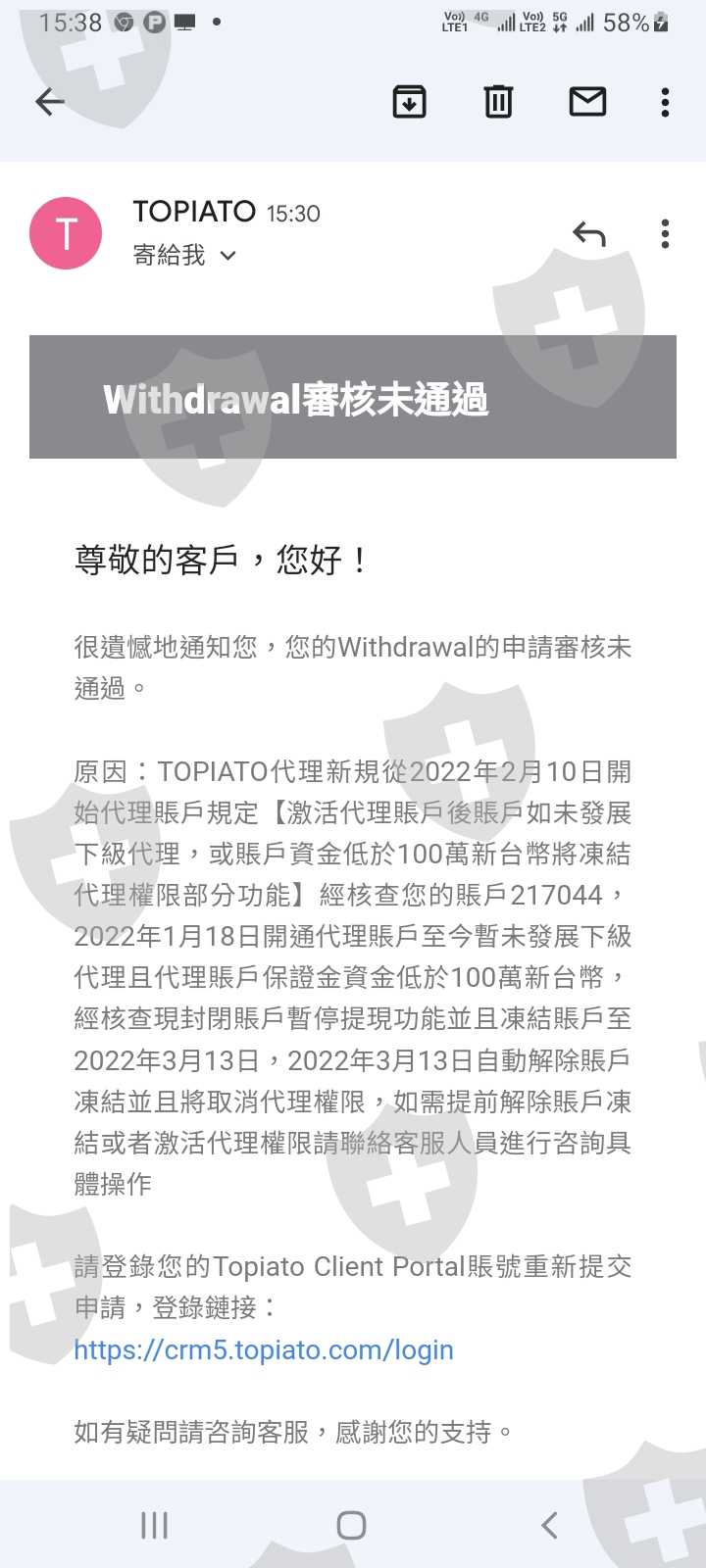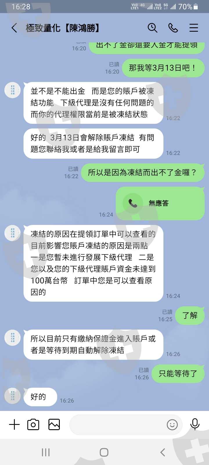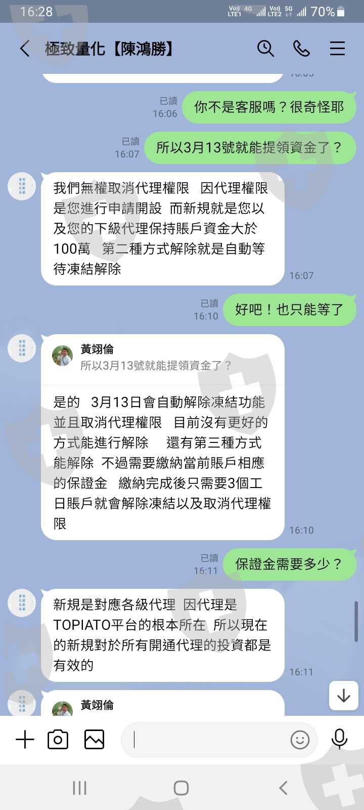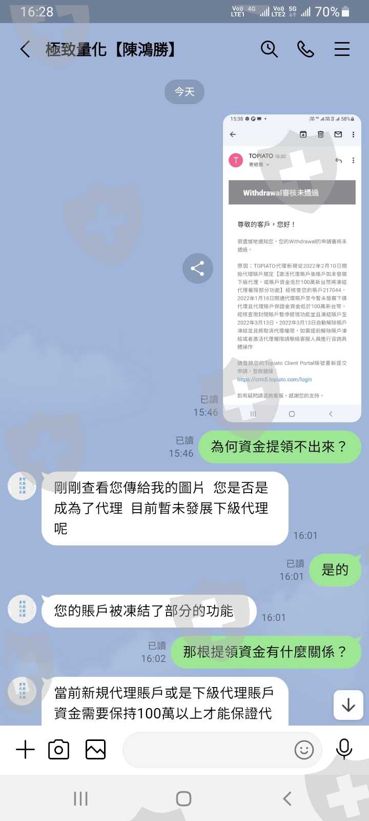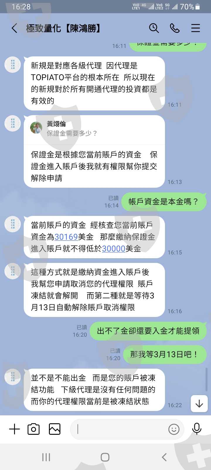網站是https://tw5.topiato.com/我要出金無法出金,客服跟我說是因為我開了代理而沒有業績的關係,導致賬戶被凍結一個月無法出金,如果要出金需要再入3萬美金才能解除凍結,以下為客服談話內容