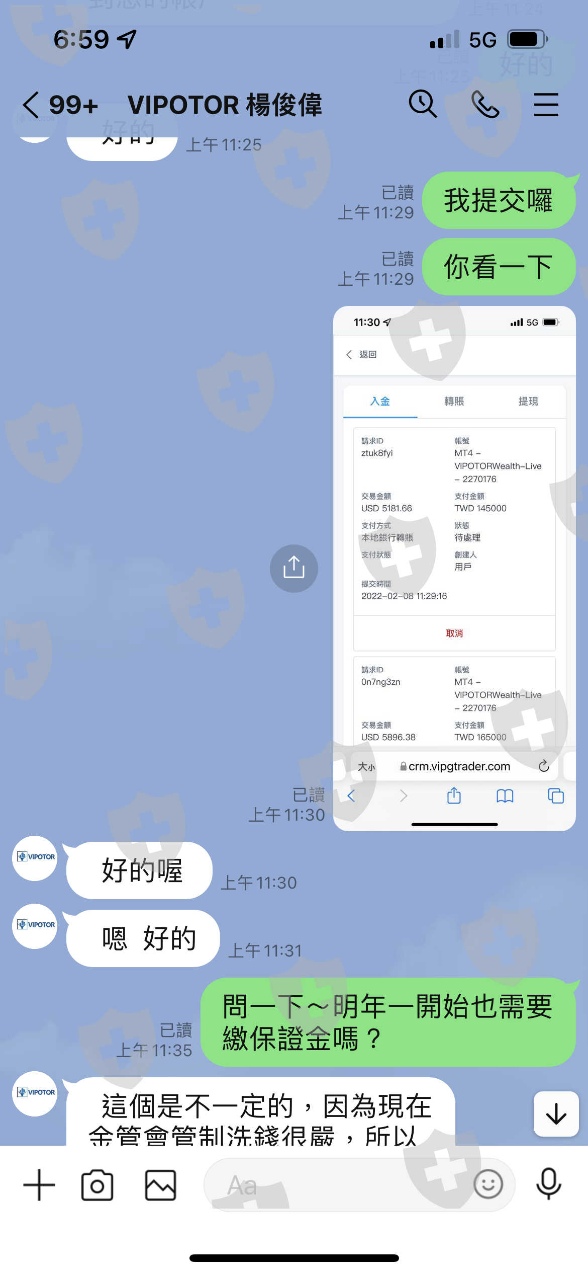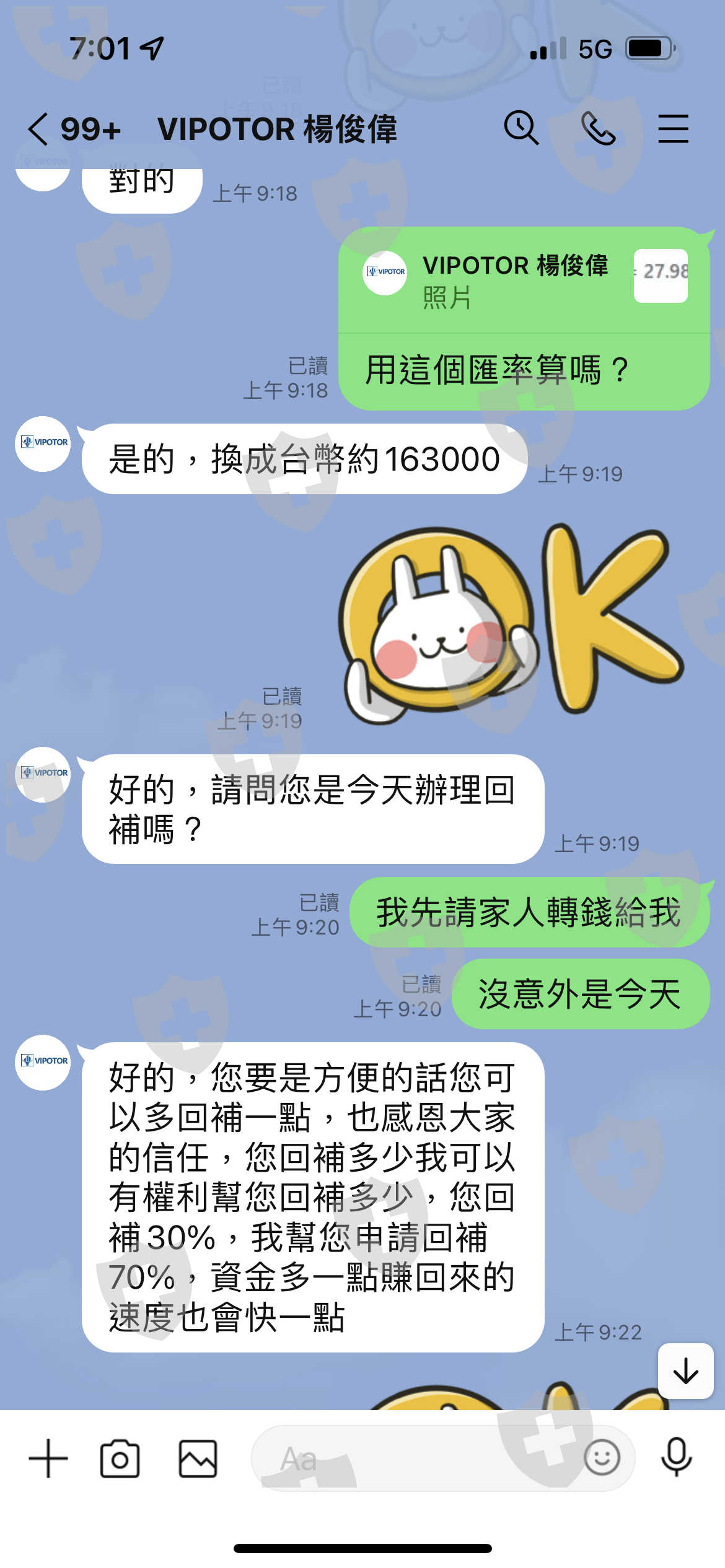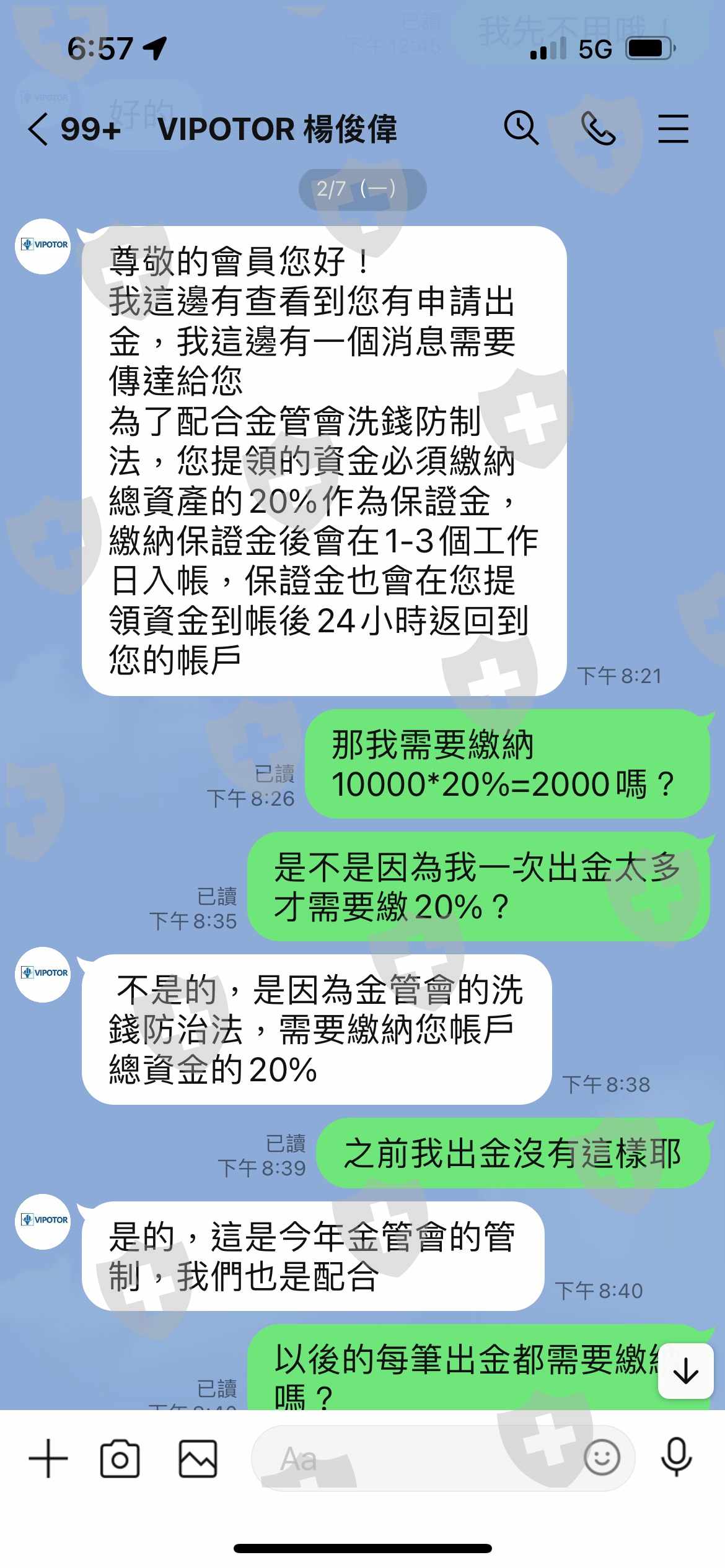 參加了Vipotor的外匯交易,入了金後過一陣子要出金就說網頁被駭客入侵導致帳戶的錢都沒了,就說我要先回補30%的資金才能還70%的錢給我,等我回補了之後要出金,又讓我繳20%的保證金,就一直無法出金,目前已經報案確認是被詐騙