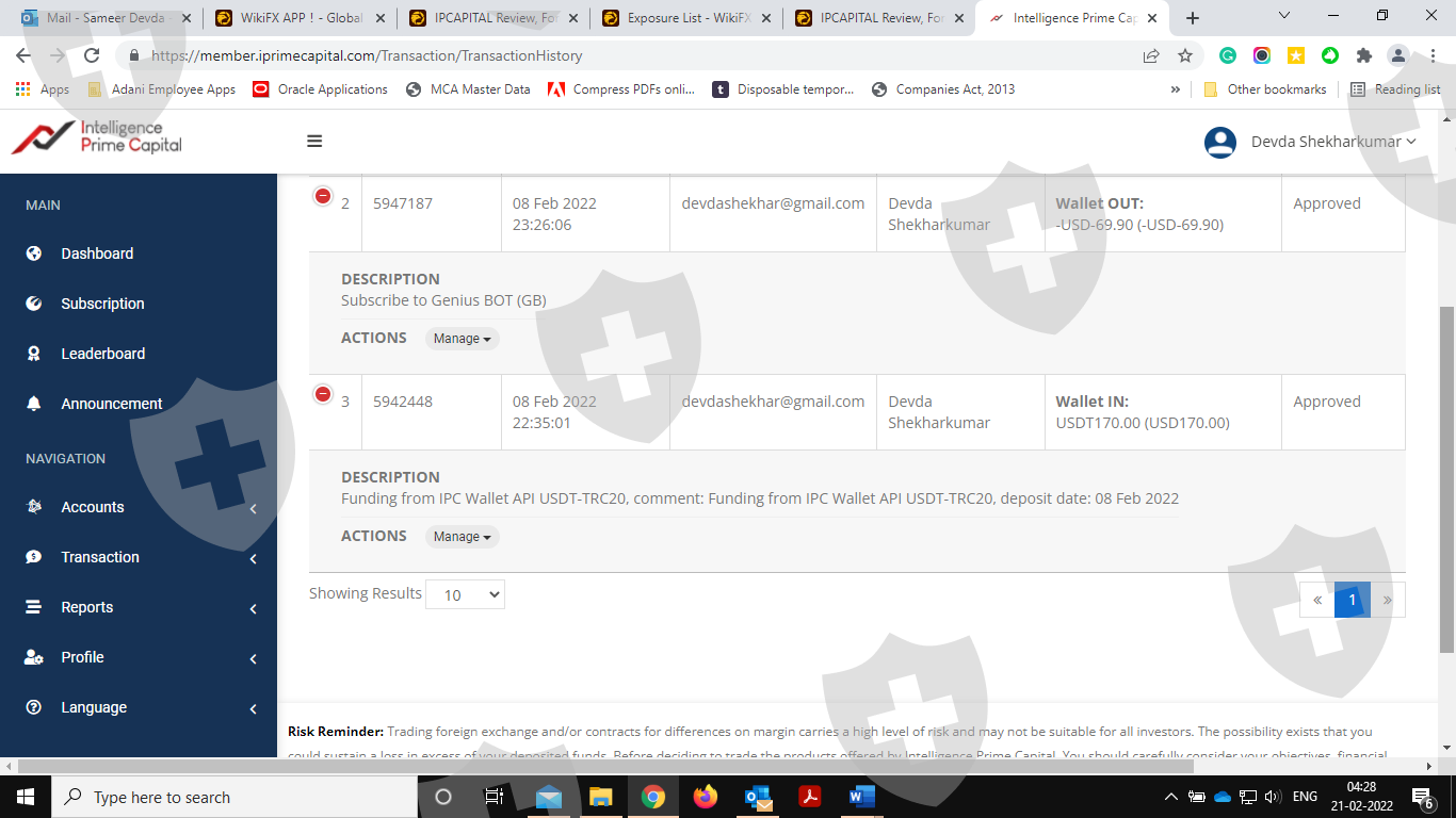 电子邮件:devdashekhar@gmail.com 问题描述:我在2022年2月8日情人节促销期间订阅了Genius bot,但它仍然显示未订阅,而且用户仍然无法在MT4账户中转移资金,用户是自上周以来无法使用IPC自动交易功能,请查看并解决他的问题。 TXID(存款问题): 85c117395b034ec06a7f206143a1763ad0fb66aa66ba4455bb2bd05ae2f18939 IPC钱包地址:TArXKFcHgi9K1GsaxuZad1MUuZcNMUihsj
