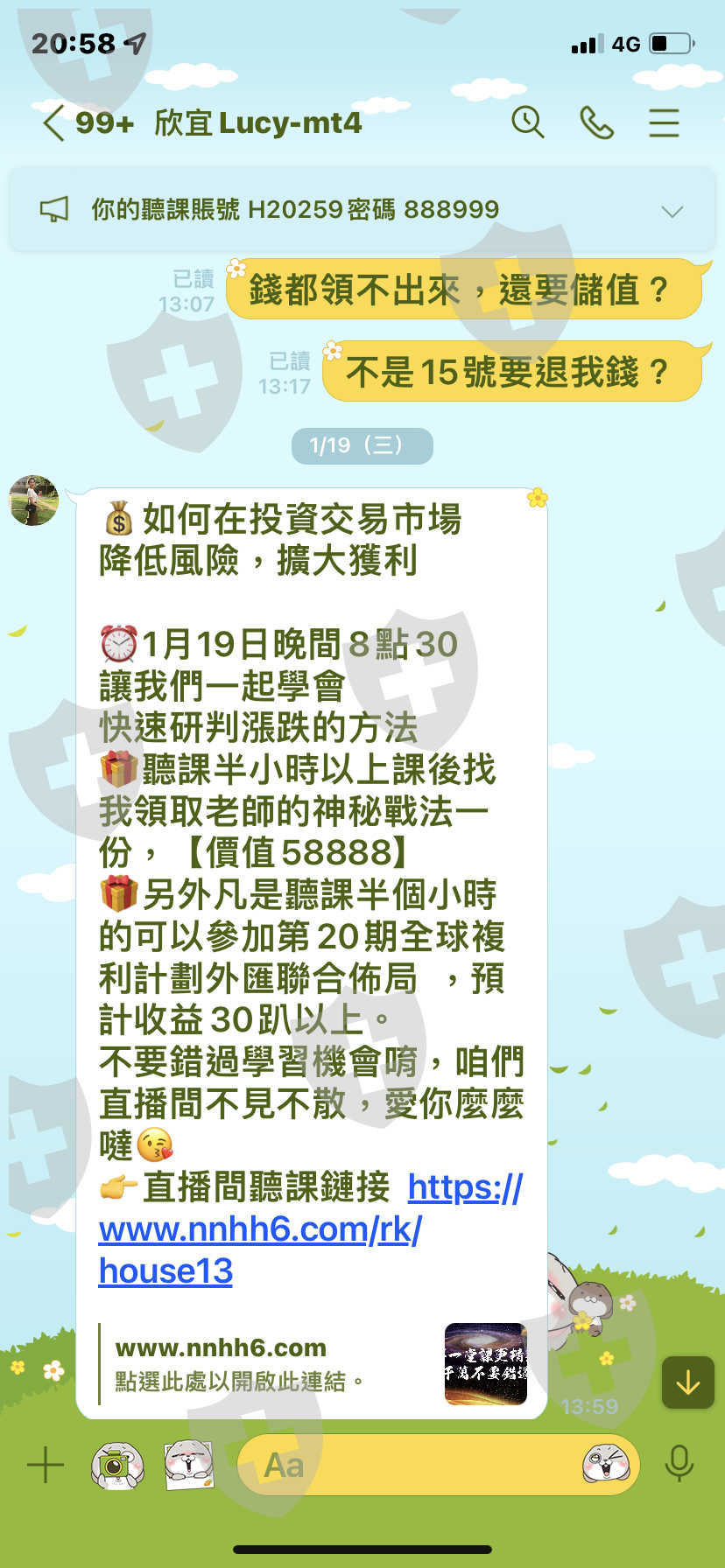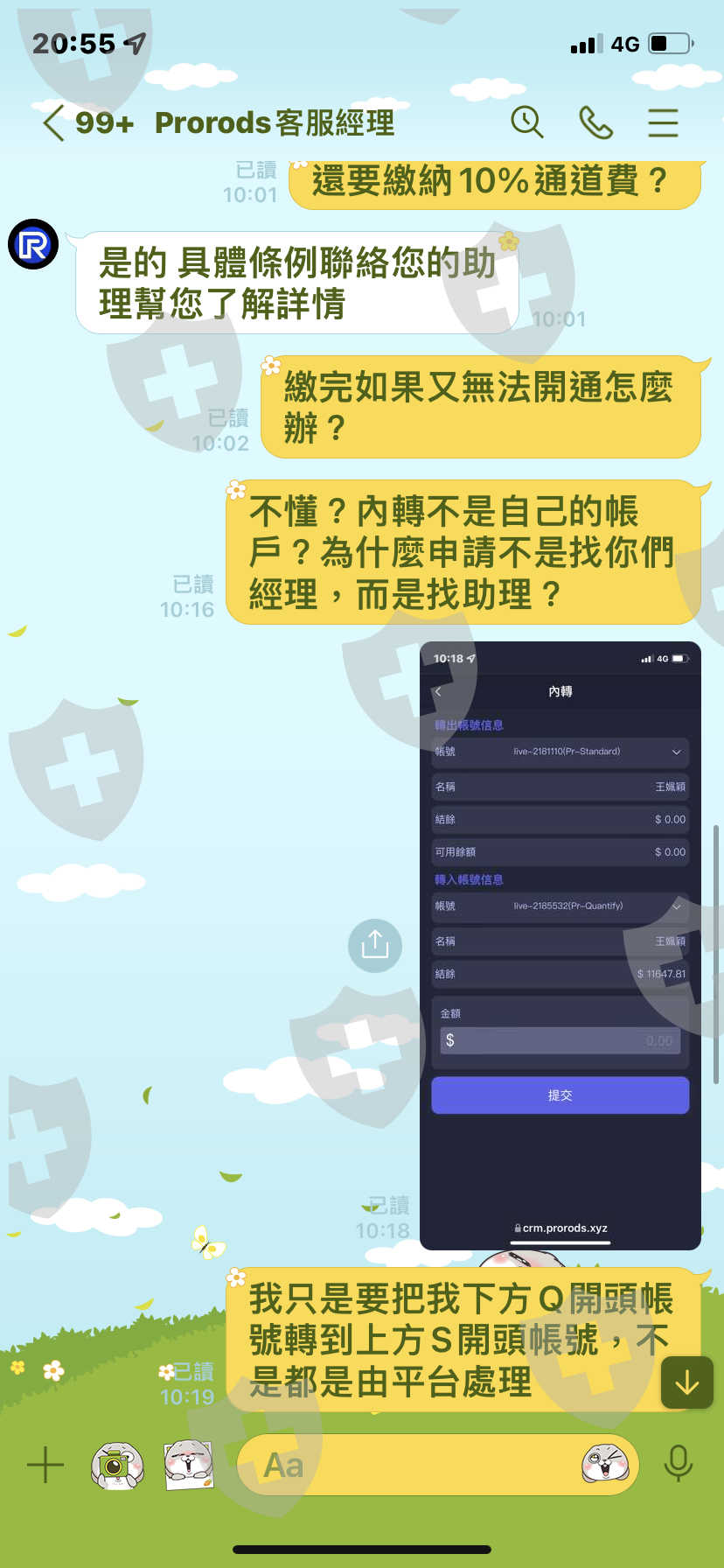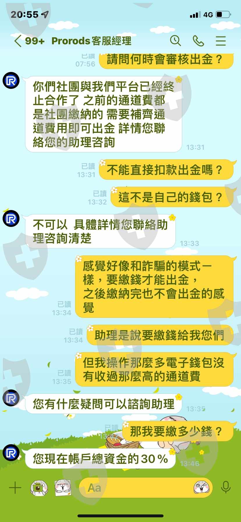 助理堅稱無風險誘導入金投資,簽了保障切結書保密,要跟著操作,虧損後ㄧ直要求投資者和prorods經理申請信用貸款,認賠後的跟單金到期後,12月說會出金,但助理說要繳交10%通道費,prorods經理又說是30%通道費,不繳交就慢慢等,但到現在過完年人就消失無回應????????