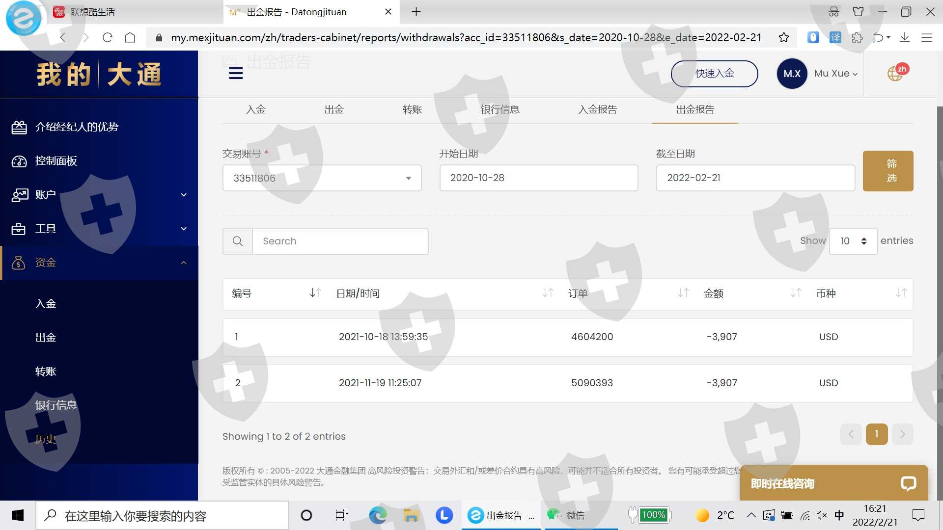 我是一个交易者,在大通这个平台也做了这么久了,从去年10月份到现在一直出不了金,你们说退出中国市场我资金退的慢我可以理解,但是都好几个月了一直都不处理,这是你能对客户的态度吗,你们这么搞谁还敢用你们平台。