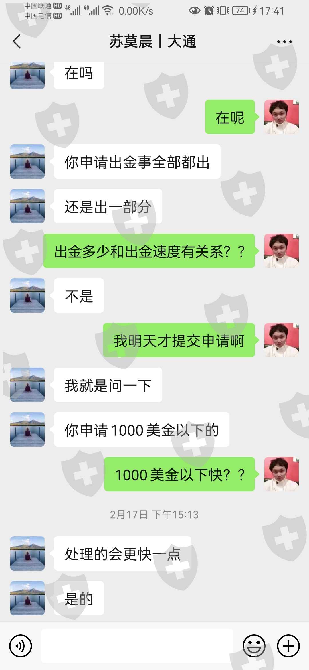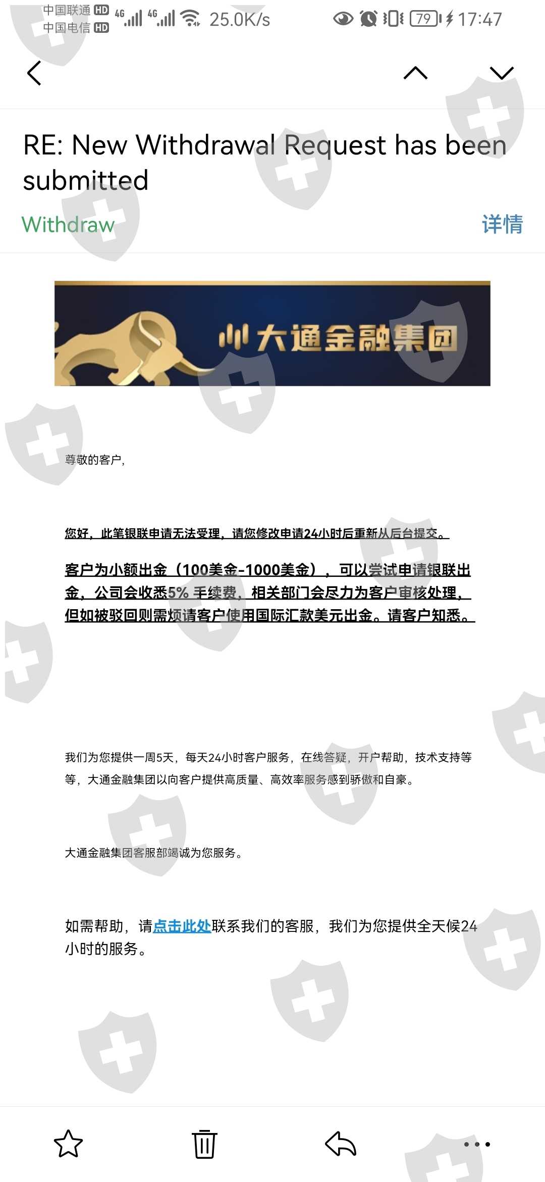 大通借一直在审批为理由,不给出金。只针对1000美金之下,收5%手续费才给出金。代理还威胁出金出不来,并且出金提交后一直不给扣款,以相关部门审批为由。