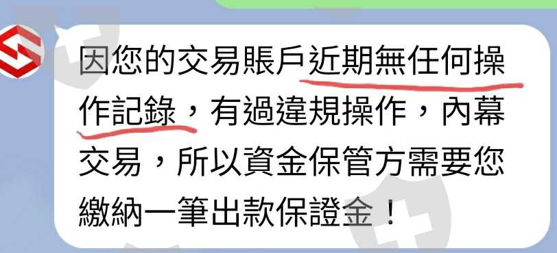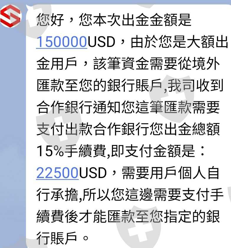 之後出金通過,反而卡在銀行端的問題:第一次需收取15%手續費,客服反饋手續費收到之後48小時內出款至帳戶,但第二次卻說明因我的帳戶近期無交易紀錄(已被平台限制無法交易)必須繳交 USD50000出款保證金。