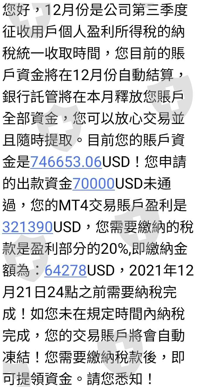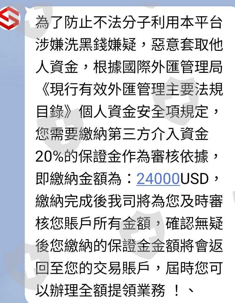 第一次要申請出金時,平台要求繳交年度20%稅金,第三方介入保證金20%,操作違規需要繳交15%罰金否則移送監管機關,避免帳號被凍結皆在時間點繳納,最後被要求6個月內不能交易且需全額提取。