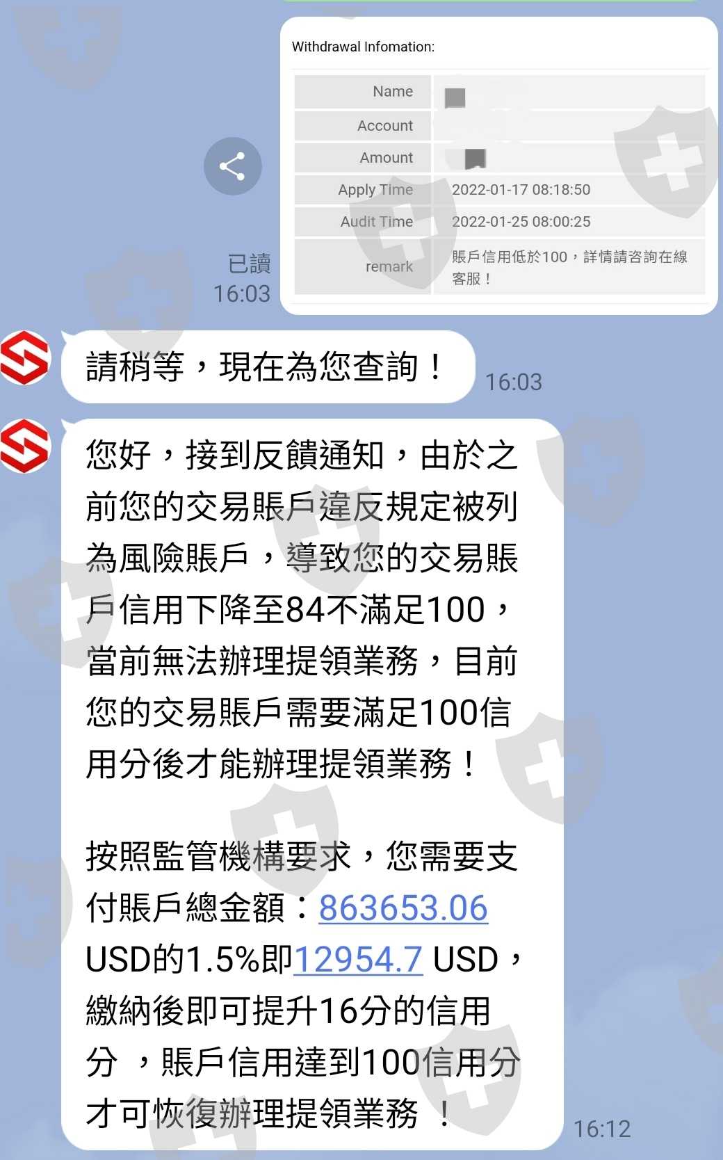 之後申請出金被拒原因信用分不夠,需入金$12954.7補足信用分,如未如期補足信用分則帳戶自動凍結。