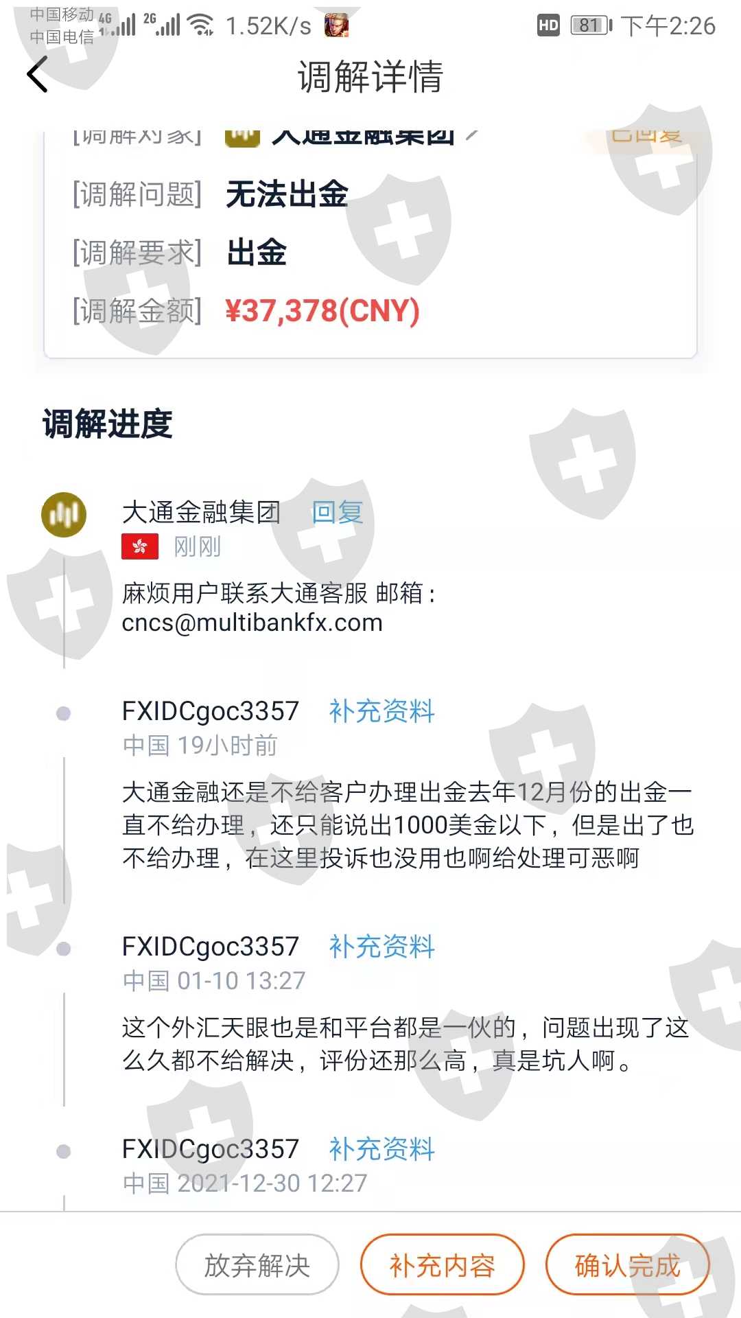 鉴于外汇行业的错综复杂,不排除有个别外汇交易商通过欺骗手段获得监管机构的合法注册。如天眼投诉所公布数据与实际情况有不符之处,请通过天眼投诉“投诉”和“纠错”功能,向我们提出,我们将及时进行核实查证,并公布相关结果。