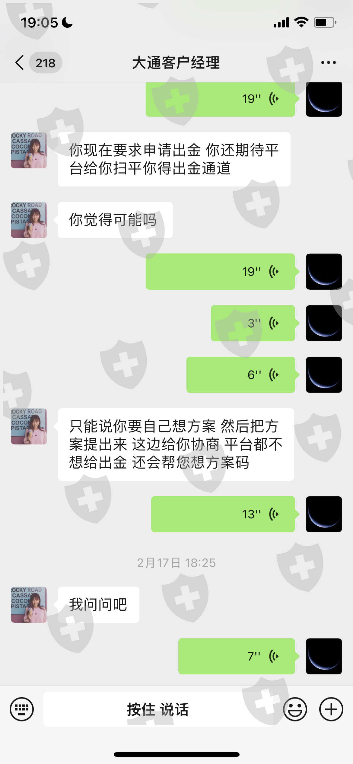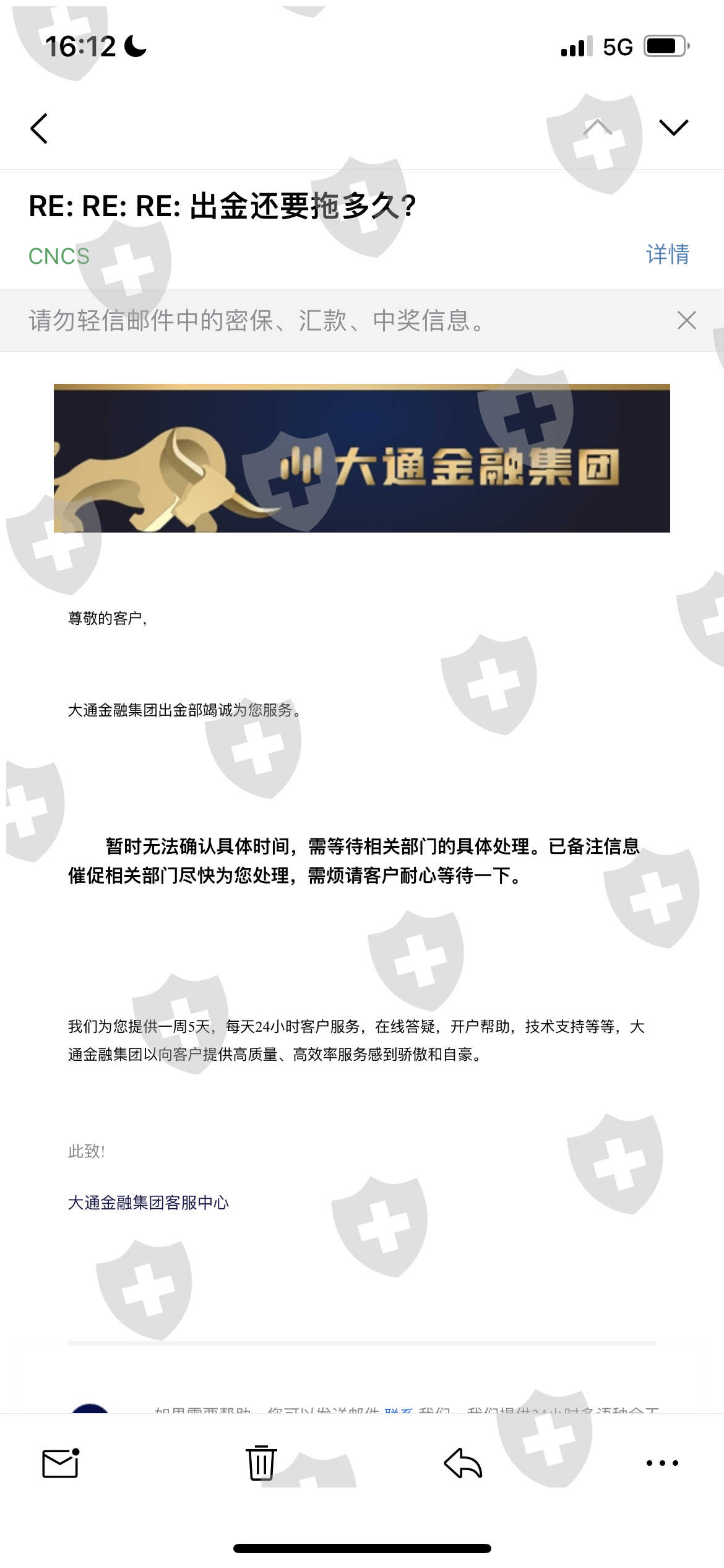 从2021年10月中旬申请出金一直拖延至今,未收到一毛钱,我的本金146794美元,期间几个月多次与大通邮箱沟通,得到的回复都是正在处理中,我想请问是万的本金太多了大通出不了?还是圈钱跑路?客户经理告知我大通不想给我出金,骗子平台,真心恶心!