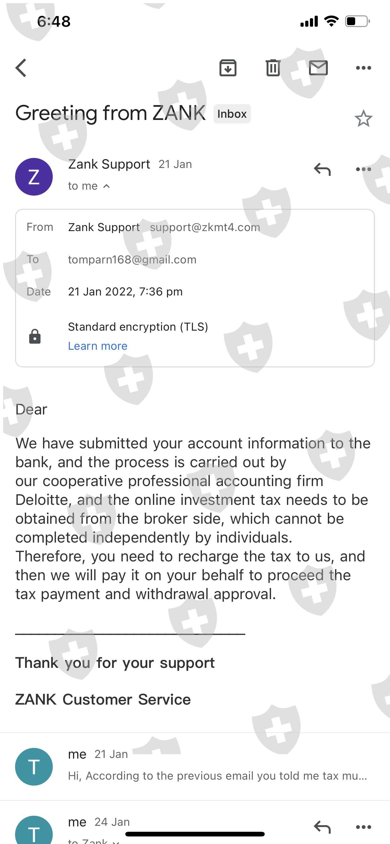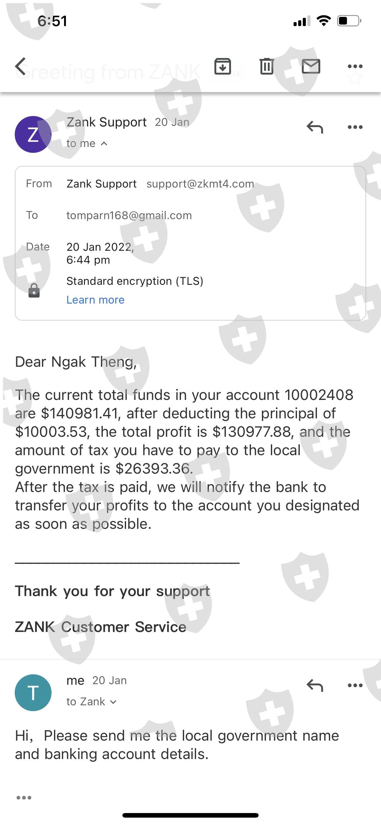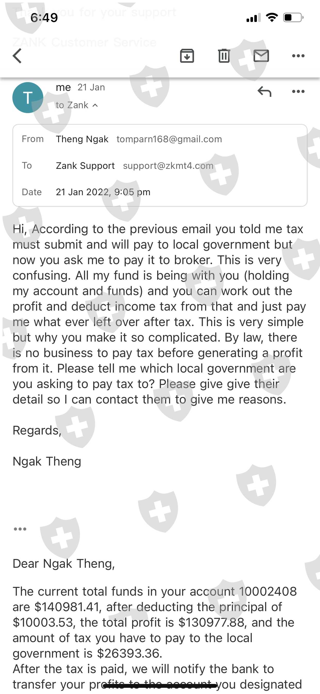 我在 Zank (Zank International Ltd) 交易MT4投资。 现在我的账户盈利,我想提取资金和盈利金,然后这个平台一直找借口要求我先把钱向他们付额外的税款。 我已经告诉他们从我的账户中扣除平台费用和税款,但他们不同意这样做。我问了他们收税款的税局名称和账户详细信息,但他们不回答。他们说一定要把钱先付到他们的平台那边才可以解决。这是一个骗局,我被这个平台欺骗了。 请大家注意并尽可能远离这个诈骗平台。 一旦你的钱进去了,你就拿不回来了。