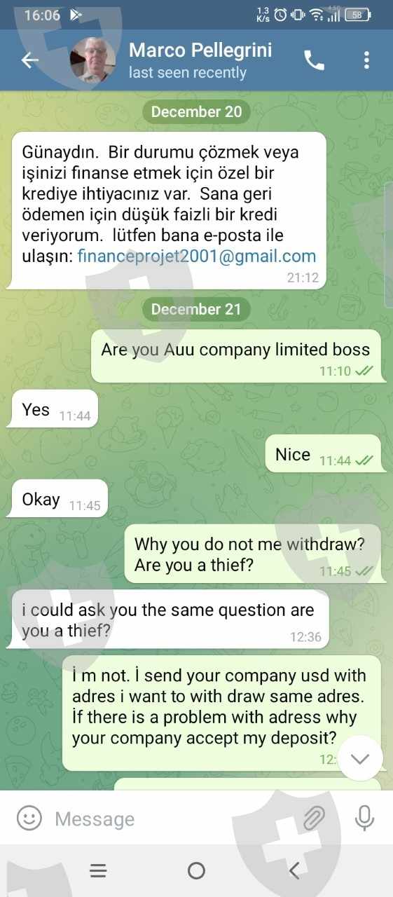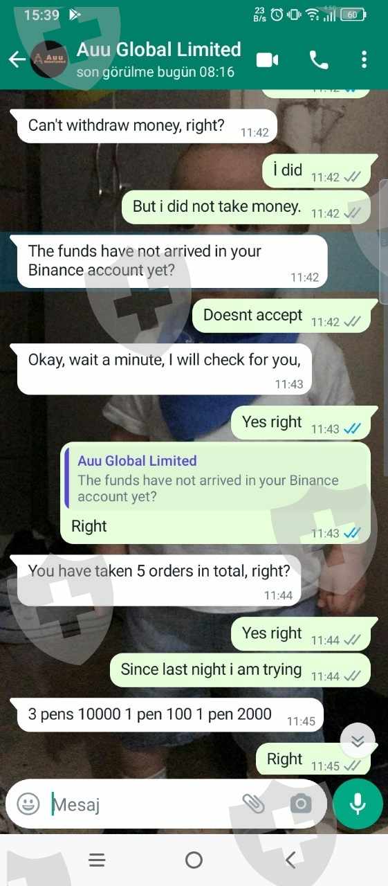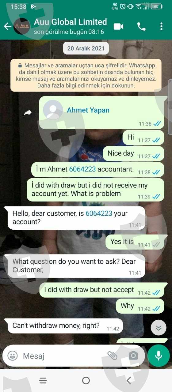 我是来自土耳其的Ahmet YAPAN。我在auu company limited的账户是6064223。我在这个账户存了50,000美元,现在账户里有超过126,000美元。当我出金时他们不接受我的提款请求。我等了2个多月没有任何变化。他们没有给出任何答案。我真的是受害者。我的心理不太好。我睡不着。我去看了医生。情况非常糟糕。公司真是小偷。