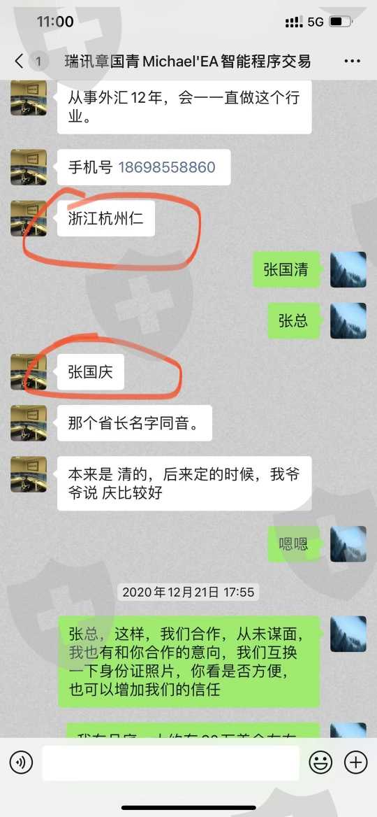 先来趴一趴,这人的历史,章国青,此人利用瑞讯代理拉近客户信任,帮助客户对冲出入金。有多个微信,多个手机号码,对外用的假名,张国庆,诈骗手法,以EA高收益,回撤小,利用客户玩A B仓对冲,单子从来不止损,此人就是个交易小白,利用A用户仓位,和B仓位进行对冲,B仓位亏损拉黑,A仓位盈利分成,目前行业已经很多受到此人的坑害,涉案金额高达500万美金,此人对外说有公司,有技术团队 ,都是自己一个人自导自演,此人在法院已经是黑户,