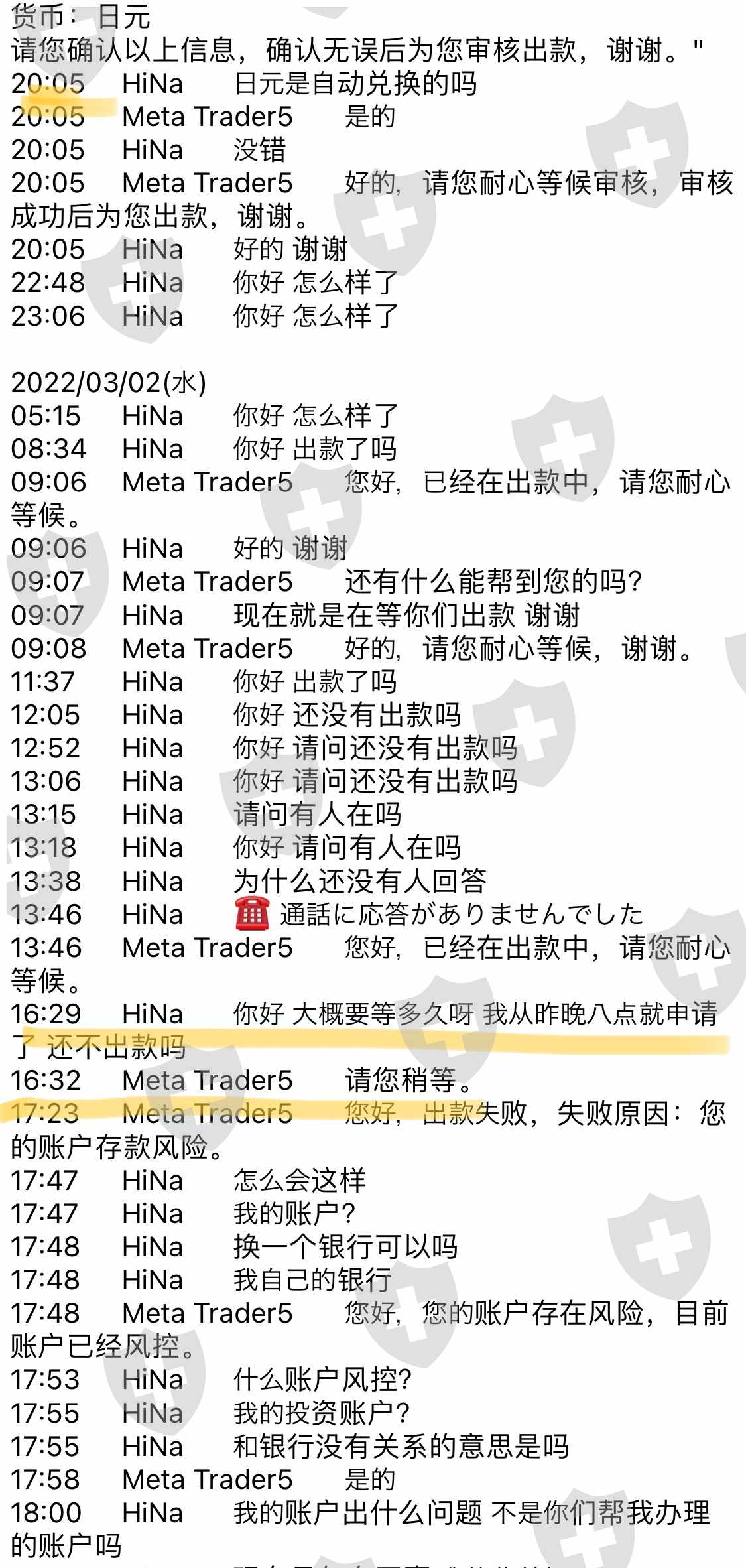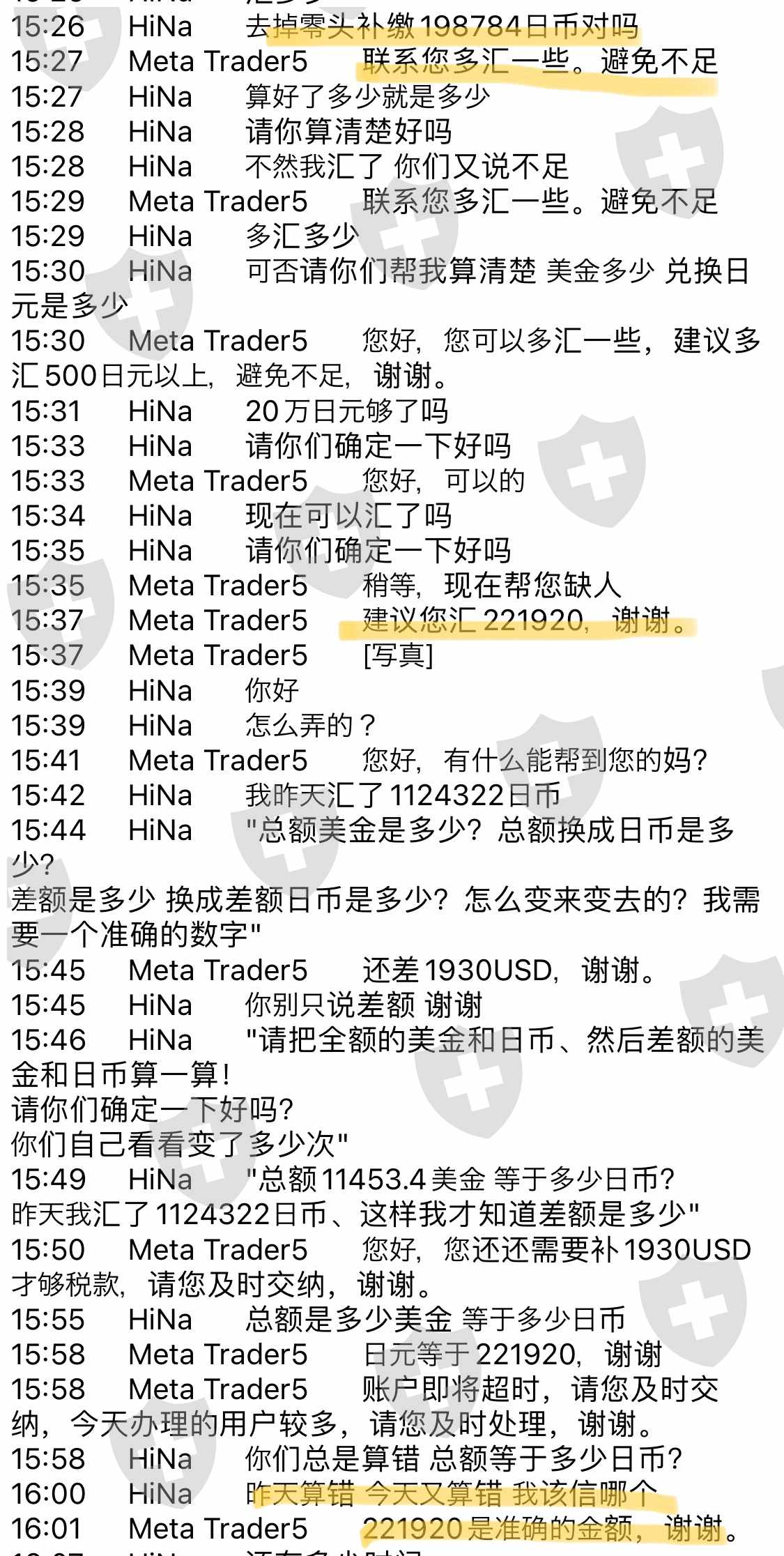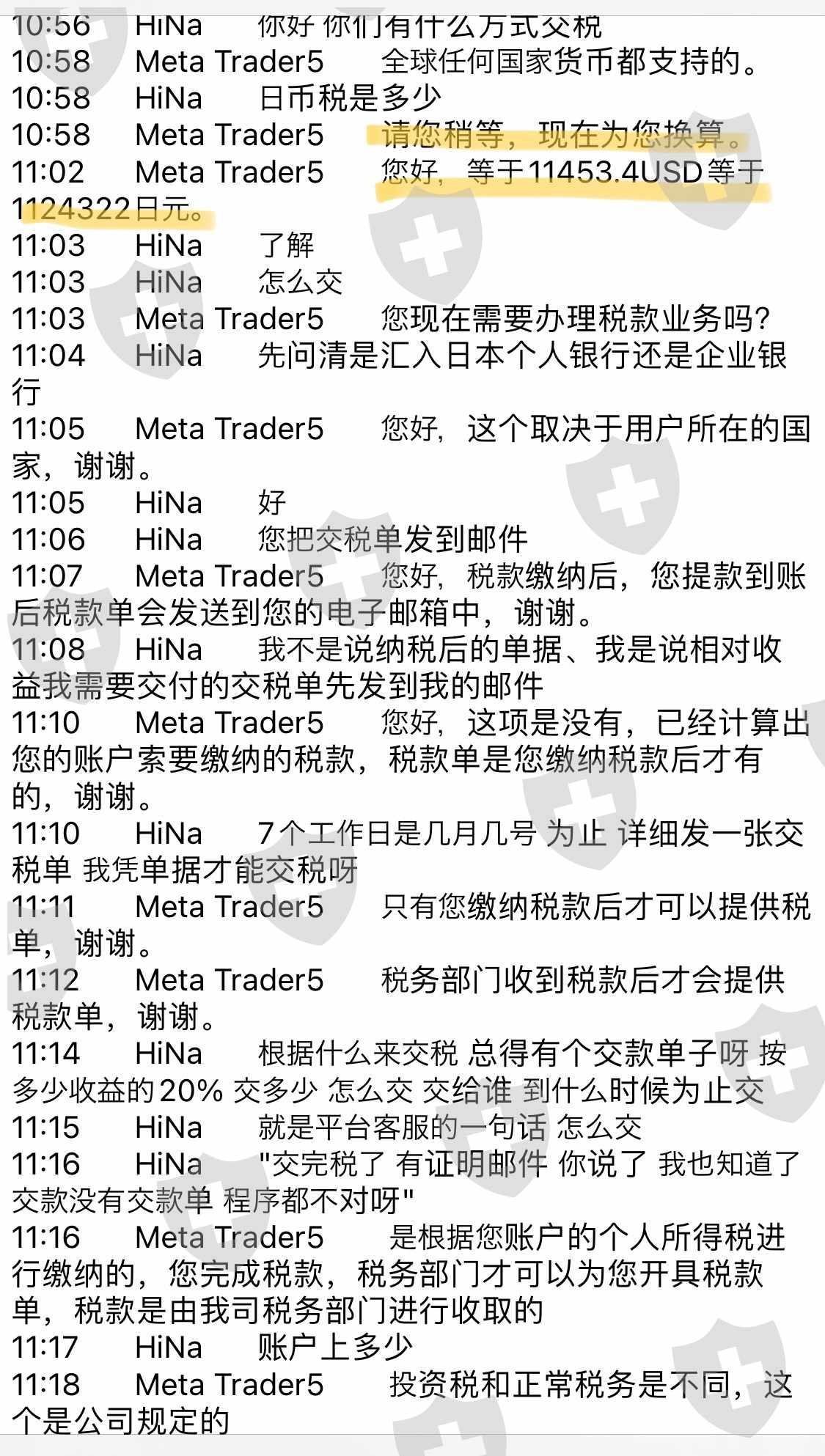 第2次申请出金时,才开始说要补交20%所得税,三番五次算错税,算错了也说没问题,之后又说不行,得先补。说好了补齐税就可以立刻出金、并且把交税证明发邮件。结果税交完了没有任何交税凭证,改口说是提款以后才能发邮件。申请提款、还是不让出金、理由是检测到交易账户有风险,又要在5日内补缴总资产10%的风险金。问他交不上怎么办,支支吾吾说不知道交不上以后的事情。
