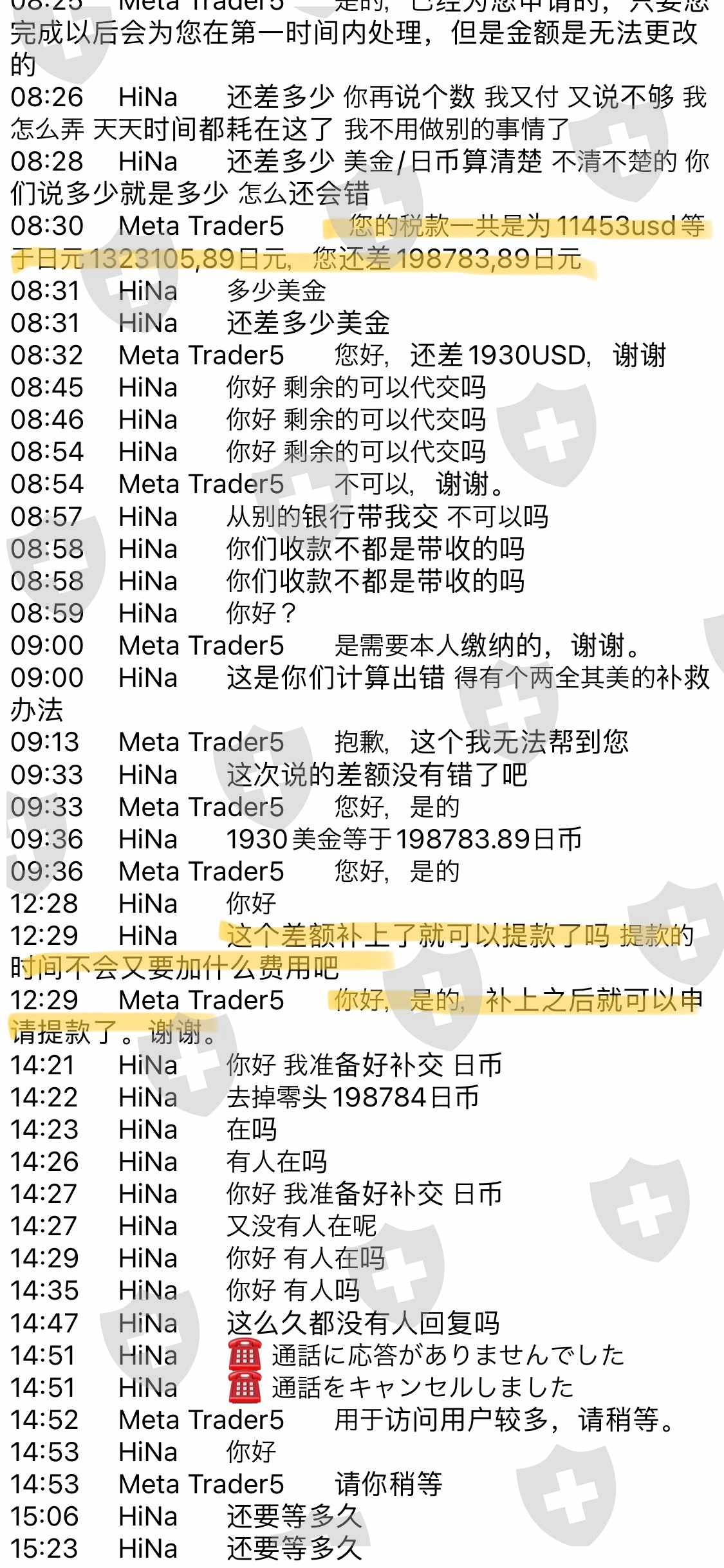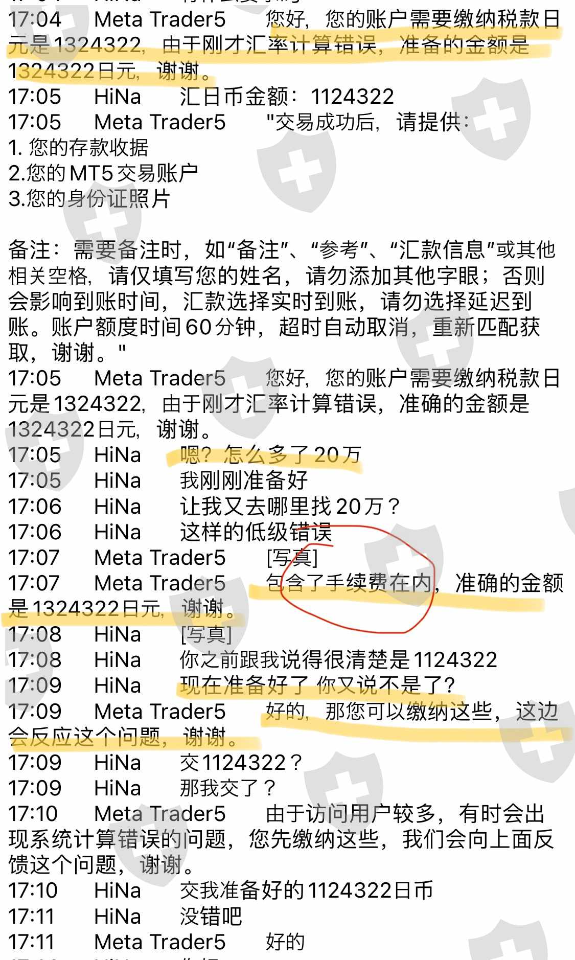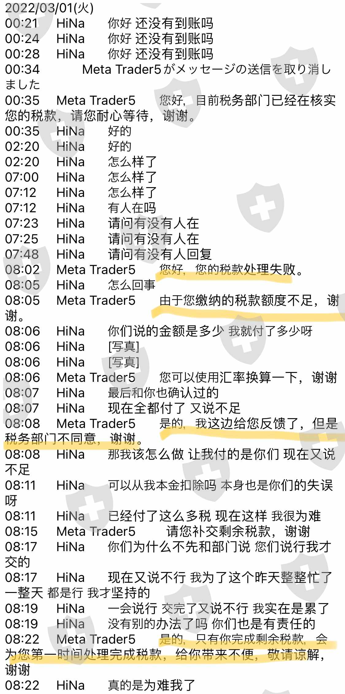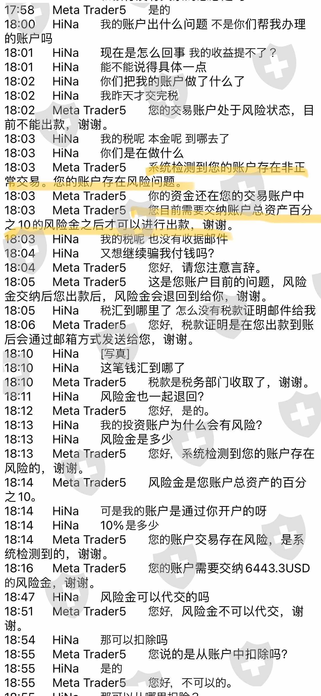 第2次申请出金时,才开始说要补交20%所得税,三番五次算错税,算错了也说没问题,之后又说不行,得先补。说好了补齐税就可以立刻出金、并且把交税证明发邮件。结果税交完了没有任何交税凭证,改口说是提款以后才能发邮件。申请提款、还是不让出金、理由是检测到交易账户有风险,又要在5日内补缴总资产10%的风险金。问他交不上怎么办,支支吾吾说不知道交不上以后的事情。
