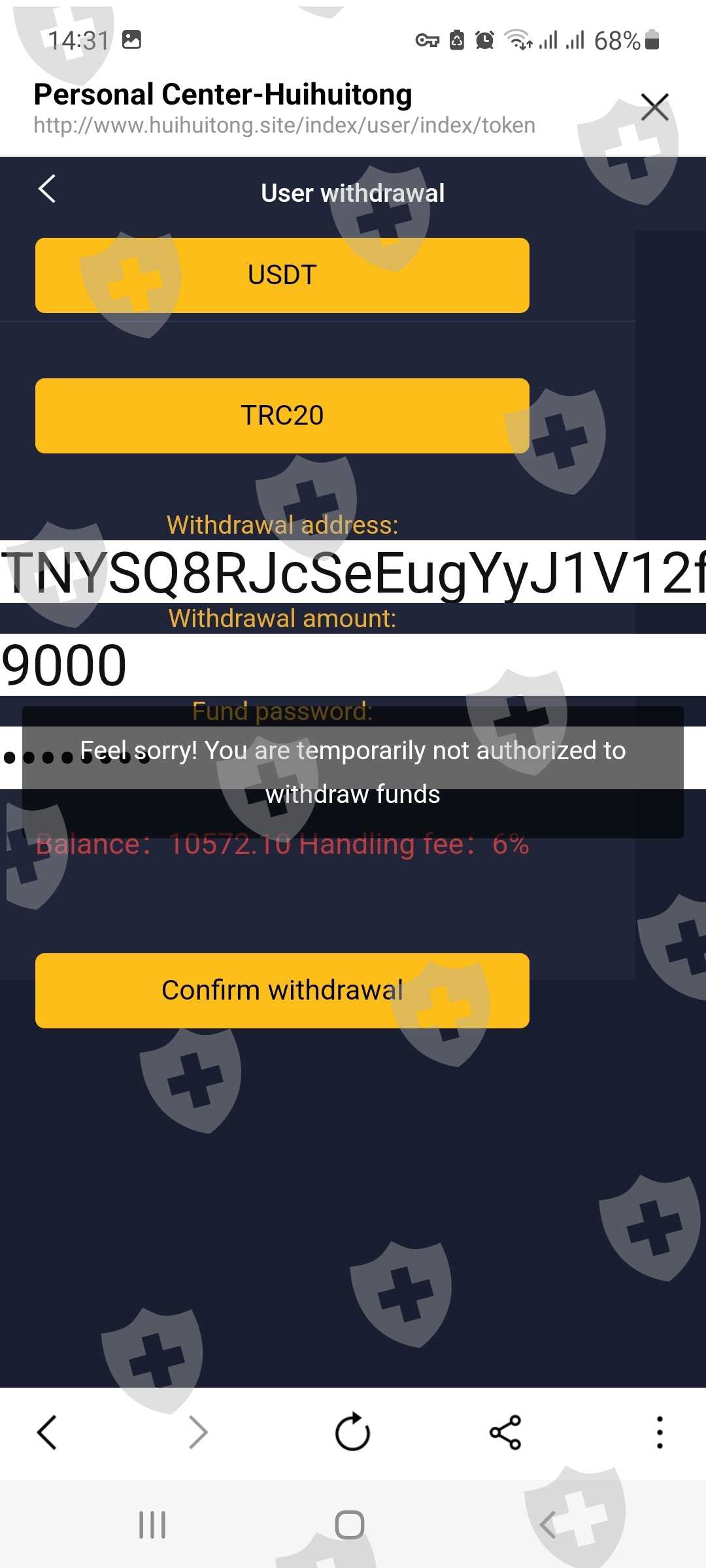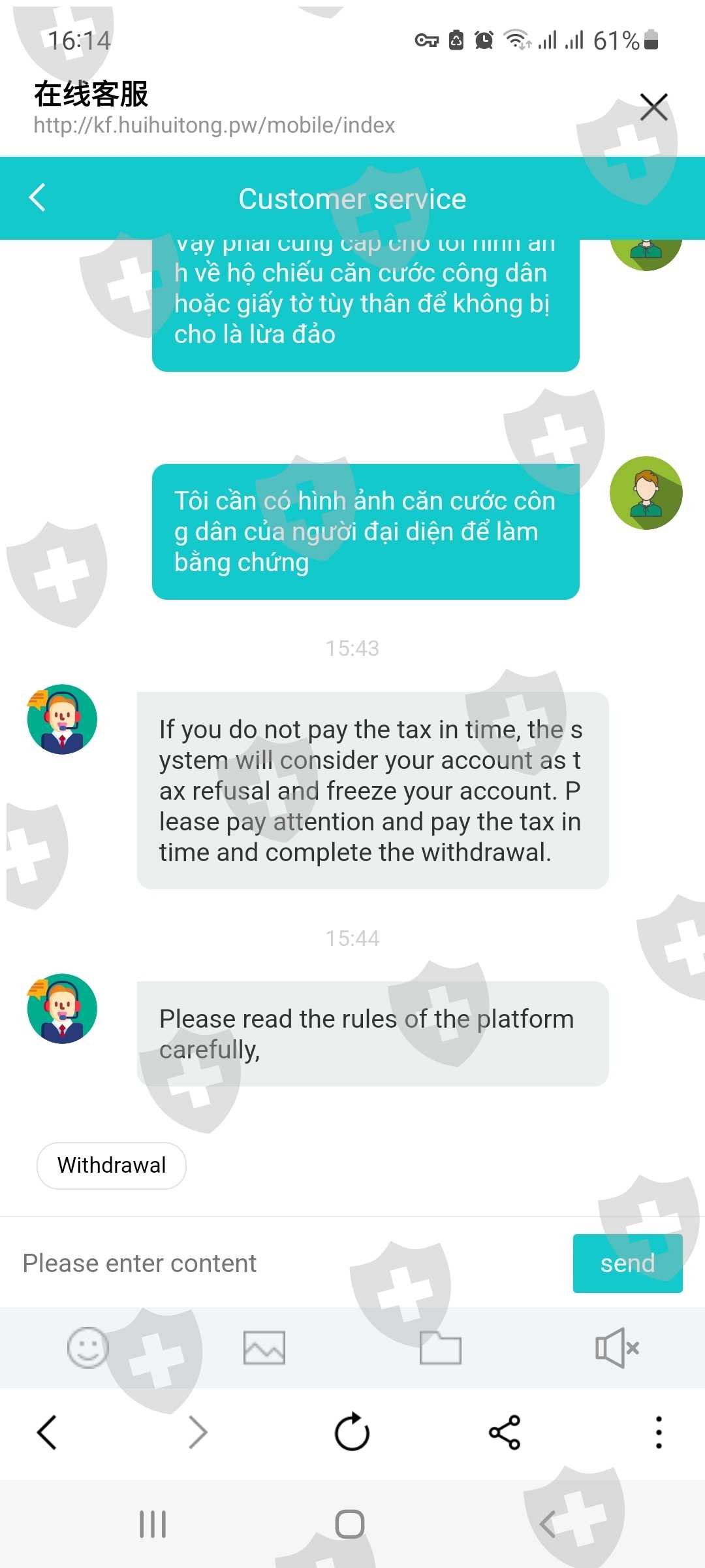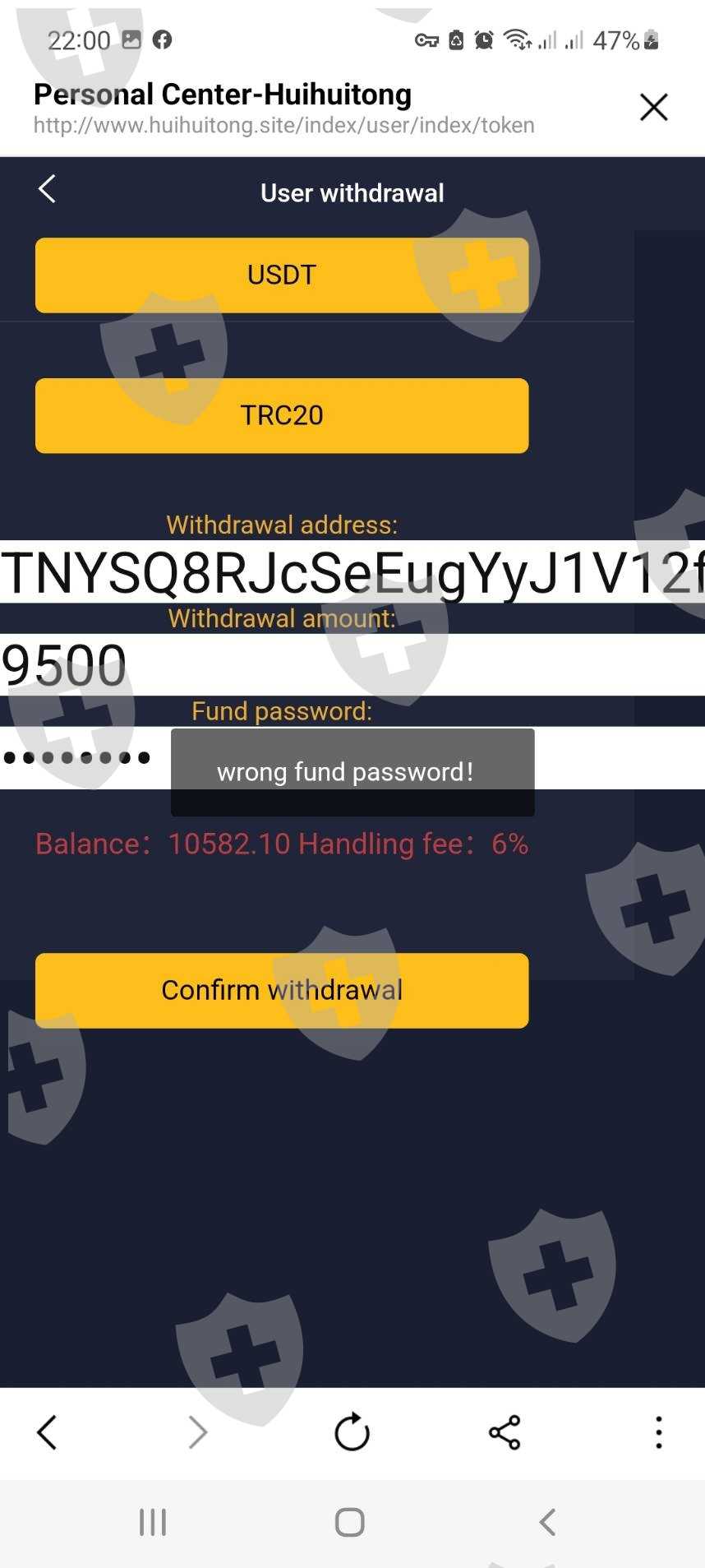 tôi bị lừa nạp tiền vào và không thể rút bây giờ còn yêu cầu đóng thuế cho tài khoản lạ,,lúc tôi nạp tiền cũng bị lừa gửi tiền từ tài khoản Huobi của mình đến một tài khoản khác,chứ không trực tiếp nạp tiền đây là link ứng dụng http://www.huihuitong.site..tôi đã bị lừa xin được trợ giúp