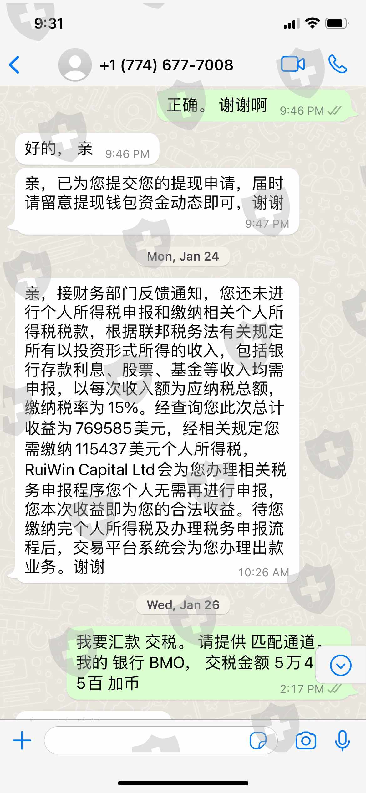 我自2021年12月起开始在RUI WIN CAPITAL交易,经过多次交易,我与平台确认提款资金。但平台表示,提款前需向平台缴纳15%的税款,税款完成后立即办理提款。我交了税又要求提款,然后他们说我之前的38万美元是别人收的,所以我要额外支付38万美元的30%作为押金,需要在平台系统停留一周,然后返回我的账户。我把所谓的质押押金转了又要求提现,先是说提现需要1-7天,后来问了好几遍,因为高峰期,改要等1-3个月提现。同时,他们要求我支付我资金的2%成为vip,vip会员可以24小时收到提款资金。我试图与他们谈判,他们只是无视我的信息。他们封锁了我的账户,并没有按承诺退还质押资金。请帮我 !谢谢