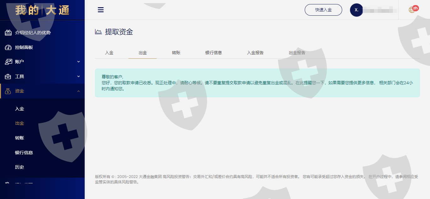 我出金半年来一直都没出金也没到帐我是也是做平台的 现在各种理由拖延 其实是他们大通老板不给你出