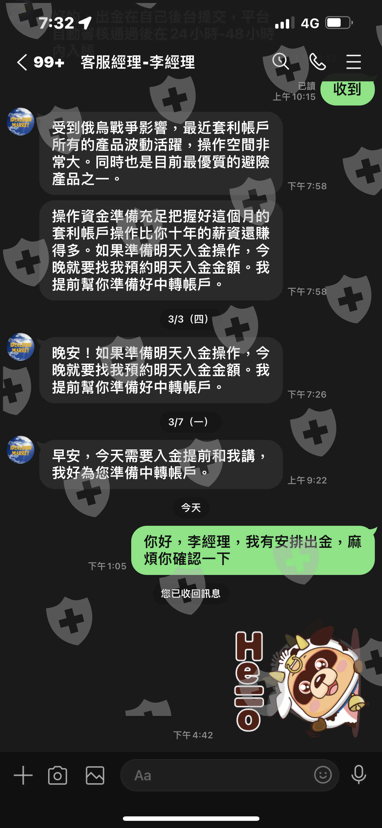 因為從3/7安排出金在3/9有詢問群創機構出金狀況,但都沒有回覆最後在3/11安排其他金額全部出金