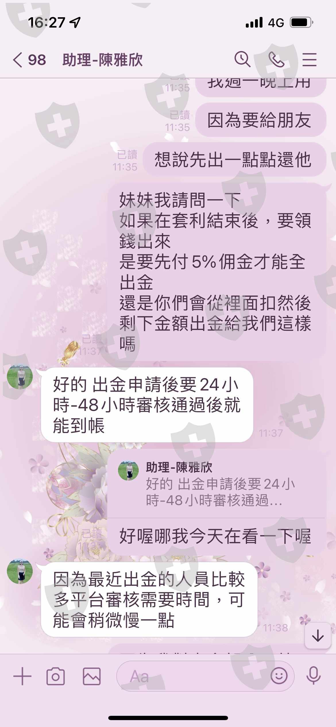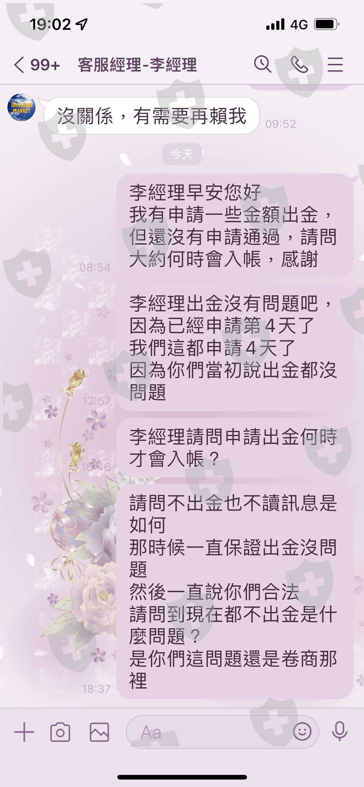 3/7開始安排第一次出金,現在在3/9問自稱是卷商的經理,出金事情,對方都以很多人安排出金為理由,然後在3/9晚上開始傳訊息都不讀不回