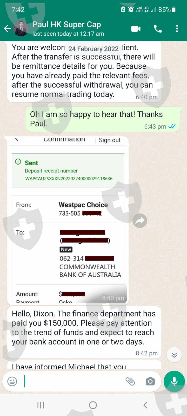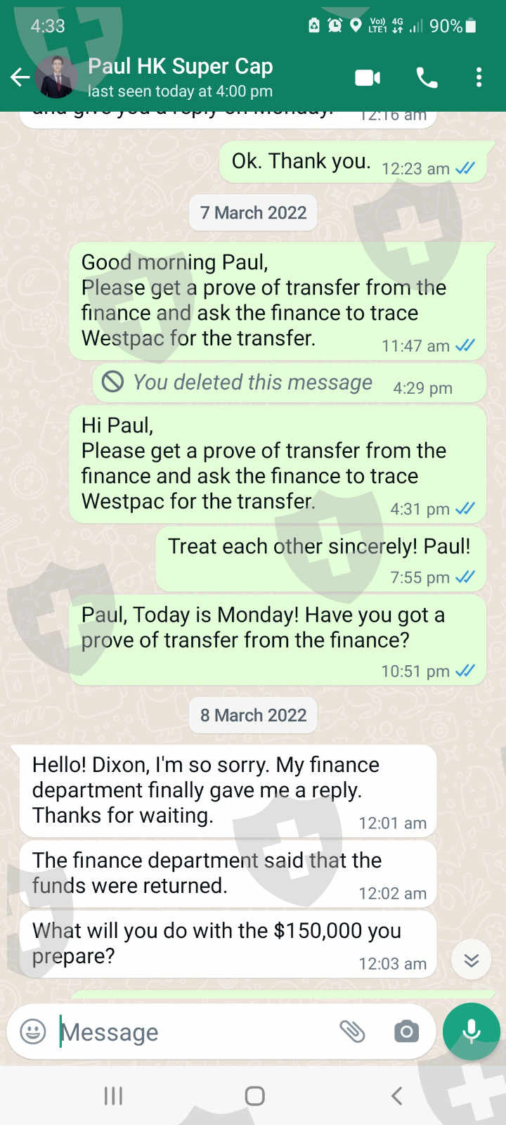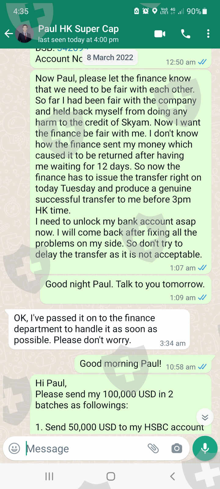 2022年2月24日,我收到了一张从Skyam Invest提取 150,000 美元的转账截图。我等了12天,资金还是没有到我的账户!2022年3月8日,Skyam的保罗通知我资金已退还,并询问我想用这笔资金做什么。我希望财务部门今天将资金重新转我的账户,因为它自2022年2 月24日以来已延迟超过 2 周。