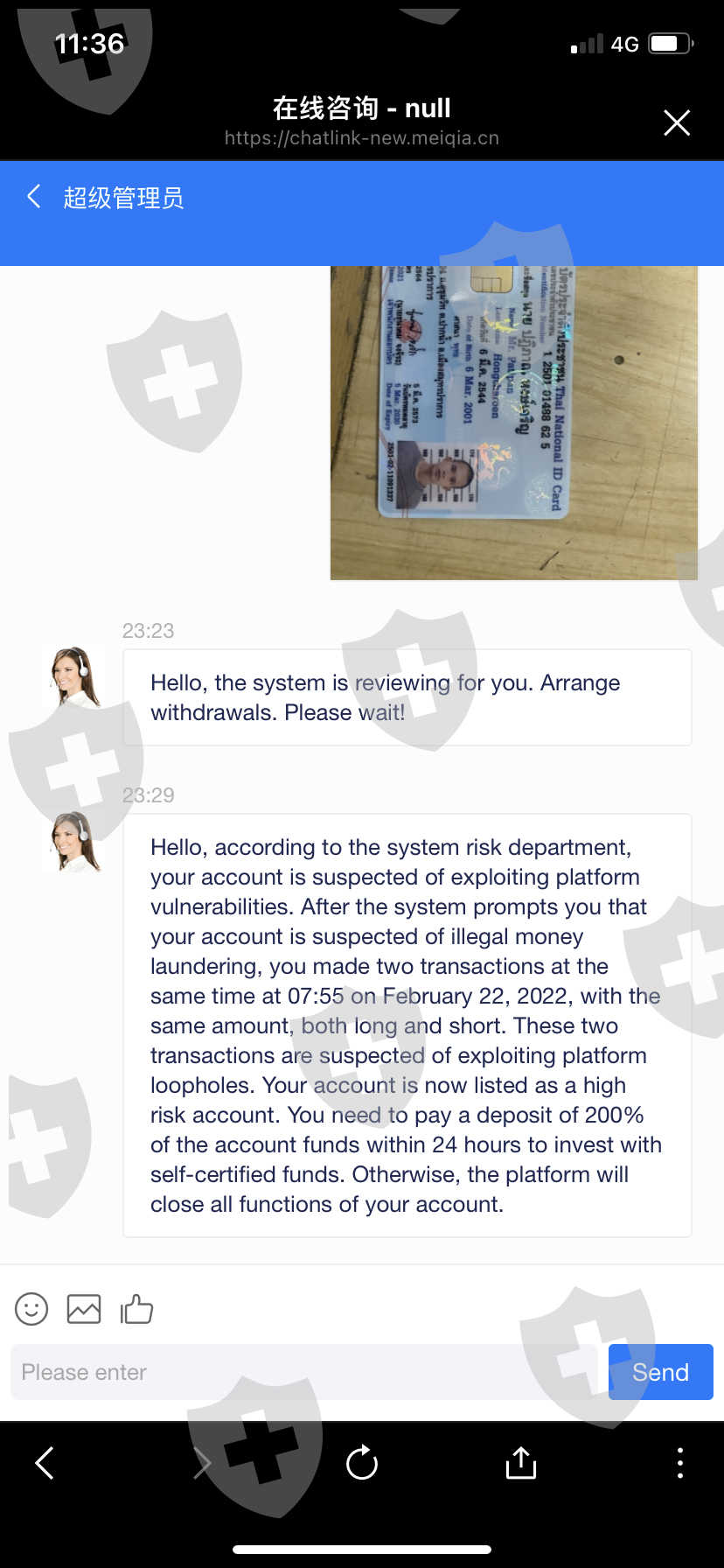 คือตอนเเรกผมโอนเงินไปแต่ว่าไม่ได้ทำการเทรดในวันนั้นๆเเล้วพอจะถอนมันบอกไม่ให้ถอนเงินต่อมามันบอกบัญชีผมเข้าข่ายการฟอกเงินเลยต้องจ่าย50%เพื่อสามารถทำรายการถอนเงินเเละฝากเงินได้เป็นปกติผมตอนนั้นคือในบัญชีผมมี3117.79$ต้องจ่ายไปครึ่งนึงคือ1558.89$หรือประมาณ55,000บาทผมก็จ่ายผ่านบัญชีธนาคารเรียบร้อยเเล้วพอบอกขอถอนเงินมันก็ไม่ให้ผมถอนบอกว่าบัญชีเข้าข่ายการฟอกเงอนมีความเสี่ยงสูงต้องจ่ายเงินอีก200%ของเงินทุน