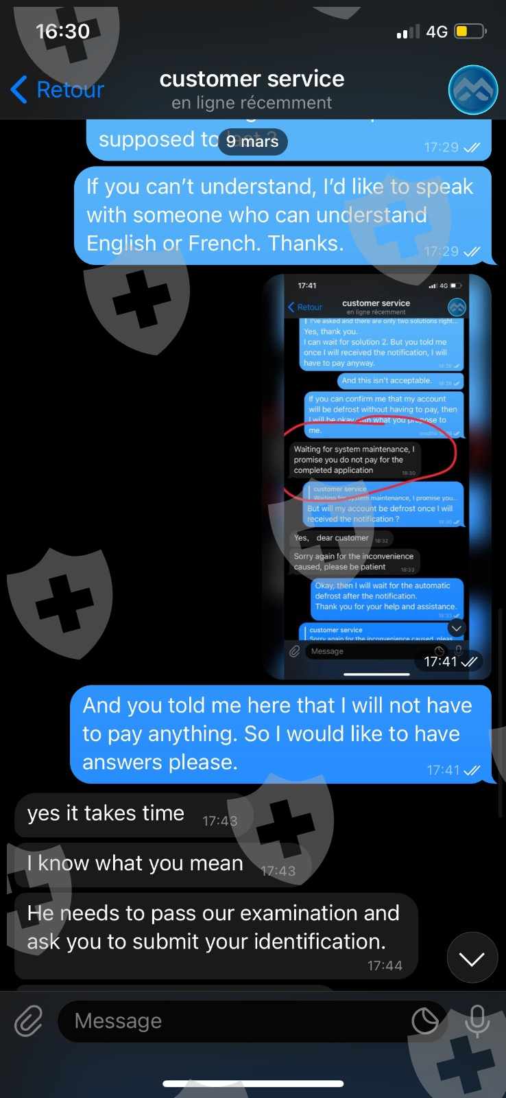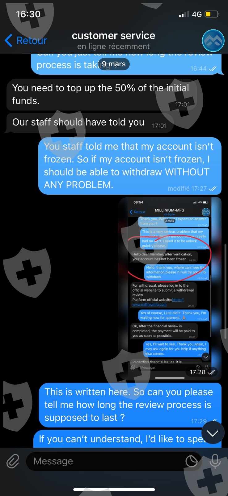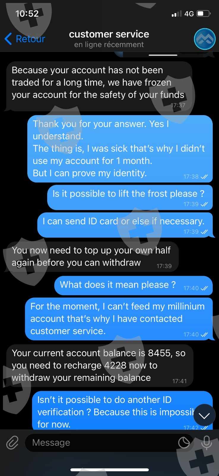 1- 您好,我于2021年12月在该交易商注册,并在核实身份后获得了认证账户。我做了几笔存款(大约 6000 欧元),并成功地提款了150欧元。由于健康问题,我在2022年1月没有活动,并于2月返回。我开了几笔成功的交易,我的账户看起来很正常,我达到了8.5k欧元。2月底,我尝试为需要的人提款200欧元,我收到一封电子邮件说提款失败,因为出于安全考虑,我的帐户因长期不活动而被冻结,他们要求我充值我的初始资金的50%以解冻我的帐户。我的帐户在没有收到通知的情况下被冻结。然后我又在Telegram上联系了客服,他们先告诉我我的账户没有被冻结,所以我再次尝试提款,今天03/16/2022,他们在告诉我耐心等待3周后删除了我的账户.他们在 Telegram 上屏蔽了我。