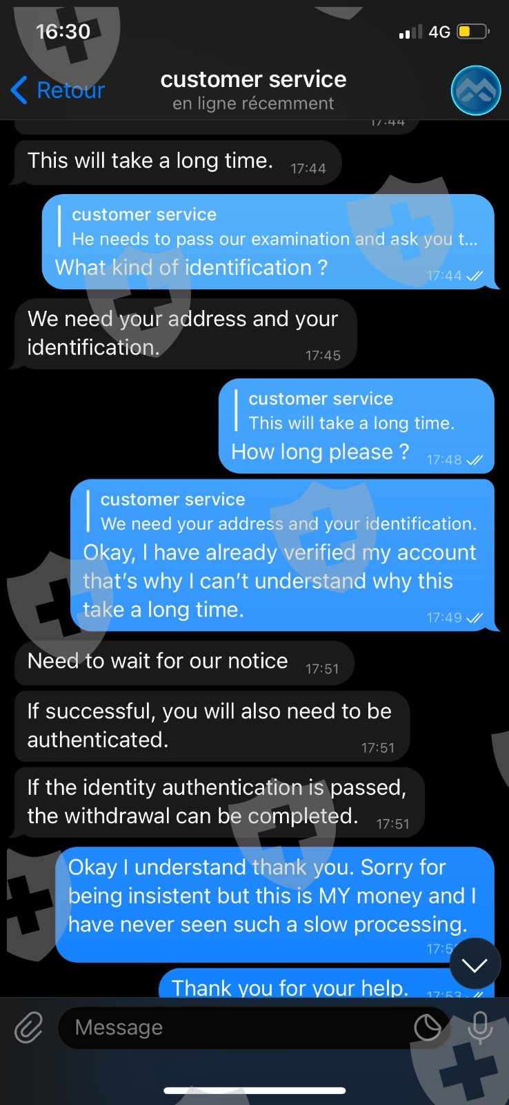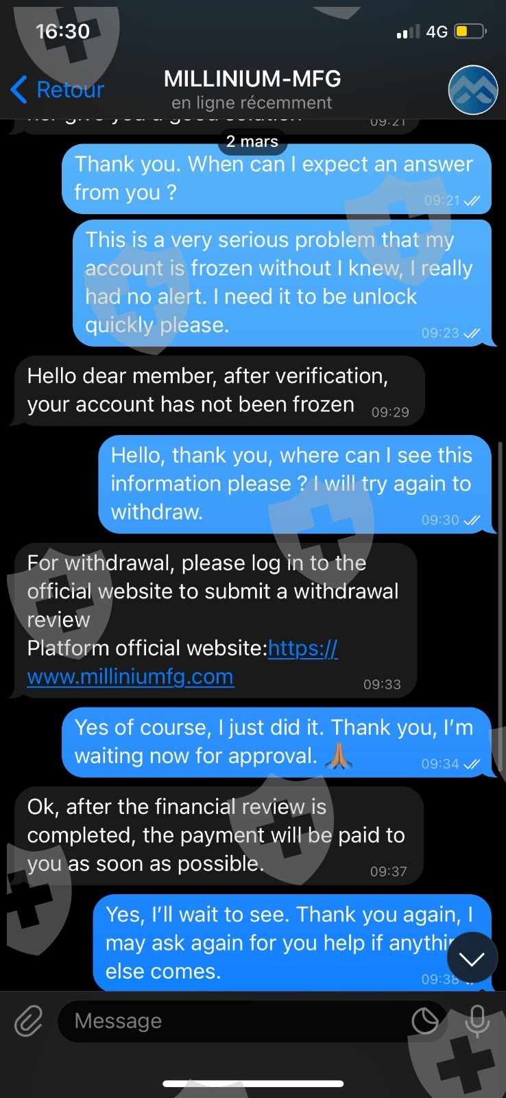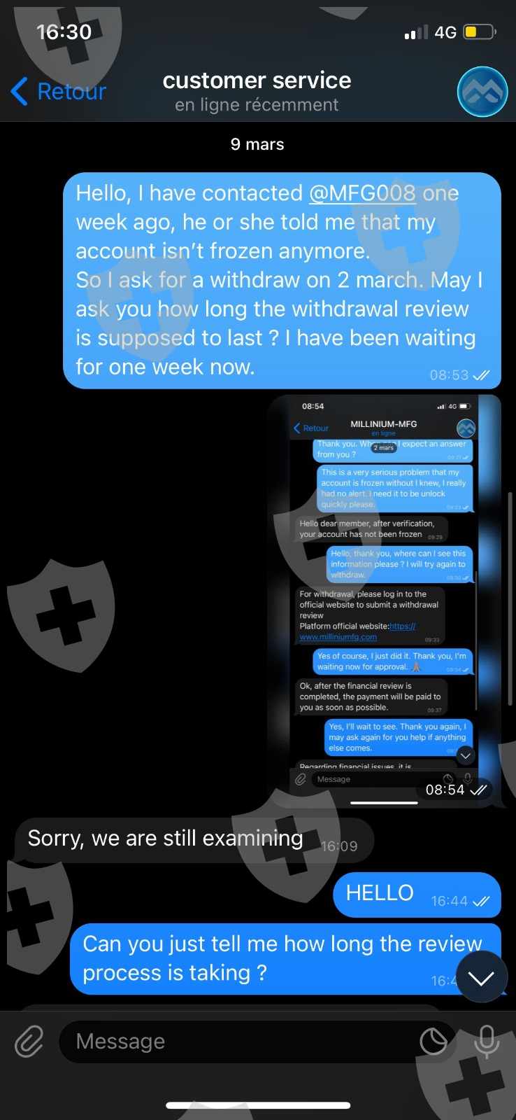 to unfreeze my account. My account has been frozen without my being informed by a notification. Then I have contacted again the customer service on Telegram, they first told me that my account was not frozen, so I tried to withdraw again and today the 03/16/2022 they have deleted my account after 3 weeks of telling me to be patient. and they have blocked me on Telegram.