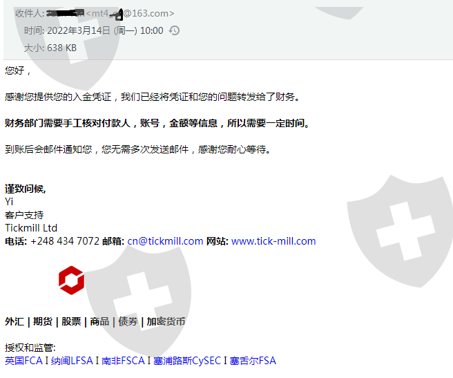 3月13日入金存款,并发送了相关凭证到Tickmill指定邮箱,对方也回复收到了。本来说的两个工作日到,但是到现在还没到。客服回复也不知道什么时候能到,太敷衍了事。这是要跑路的节奏么?