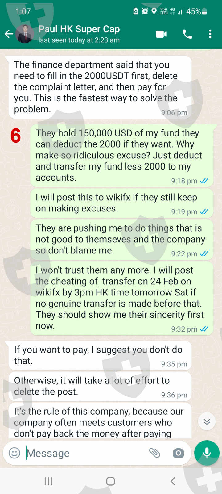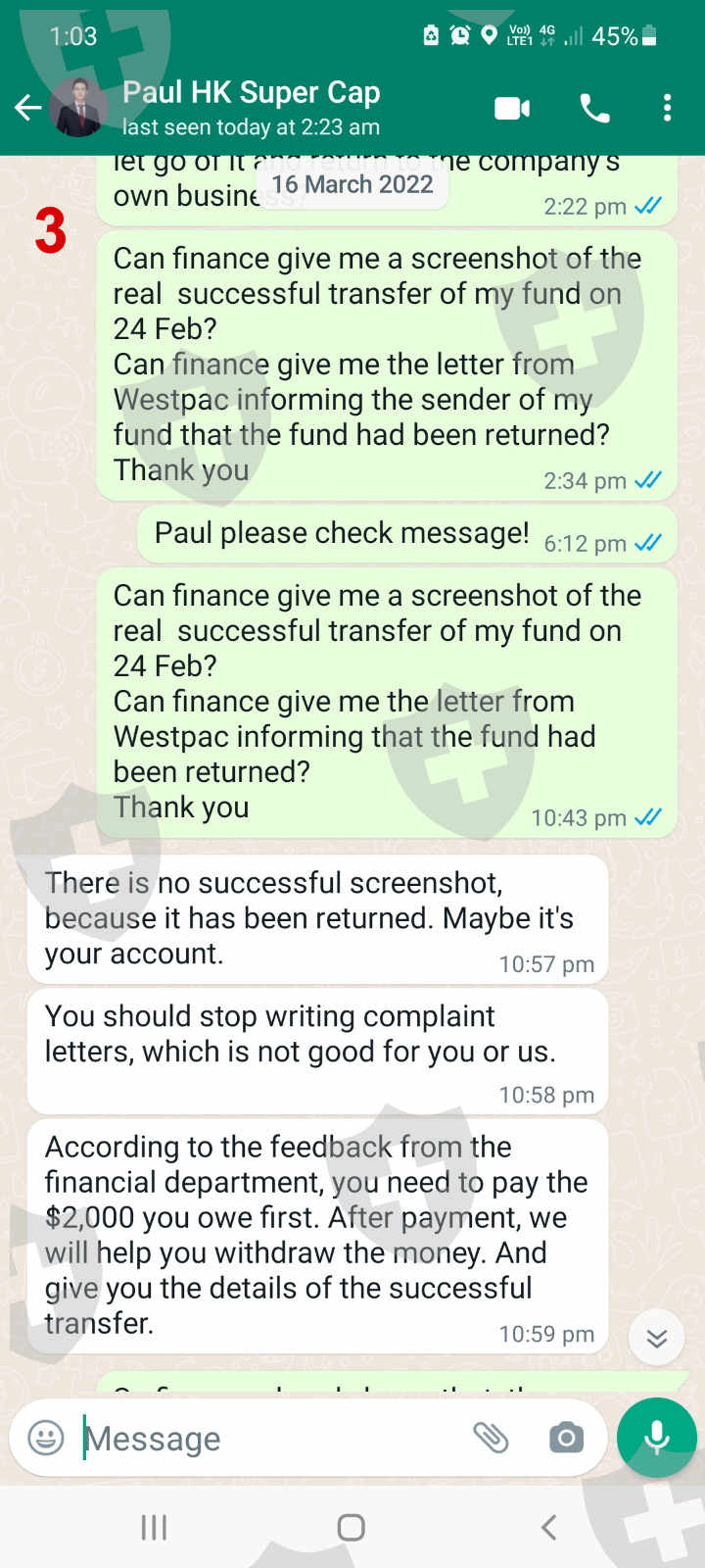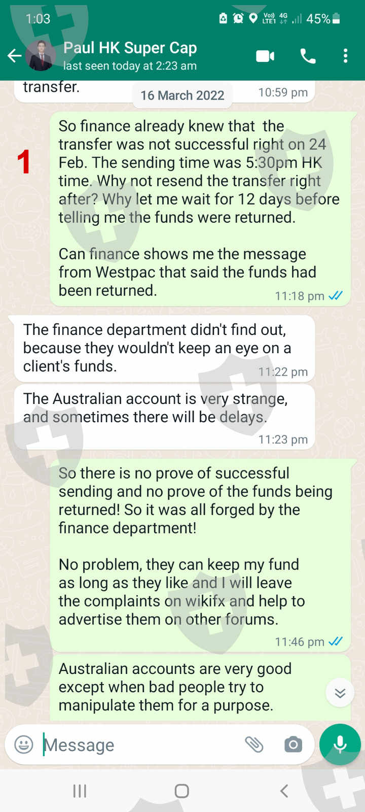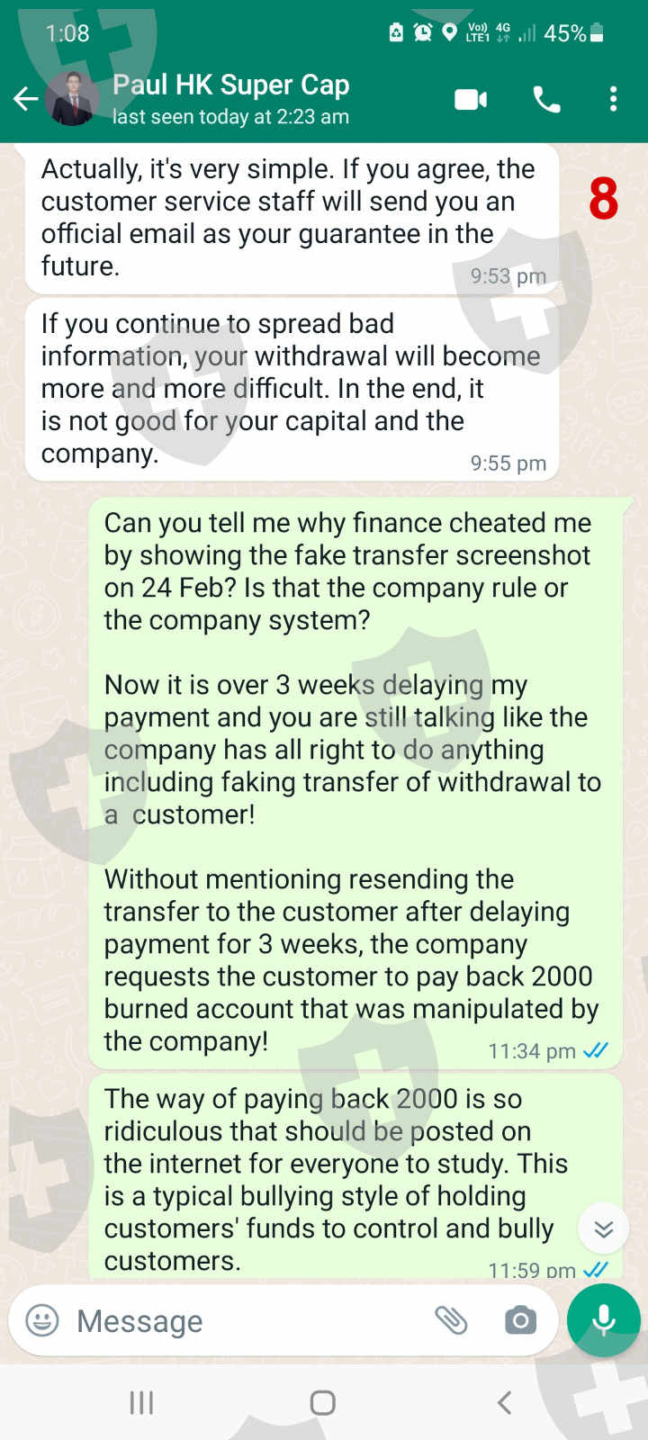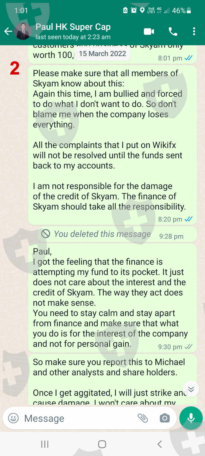 This is an update of exposure posted on 13 Mar 2022 with title: Withdraw since 24 Feb 2022. Finally I found out that the receipt of transfer on 24 Feb 2022 is a fake transfer receipt. After 2 weeks of requesting the prove of transfer and return fund, I was not provided any of them from the finance. On 18 Mar I got confirmation from the bank that there was no such transfer in the relevant account. After the faking transfer was exposed, the finance department keeps on delaying the transfer of my fund. Now the finance ridiculously asked for the payment of 2000 from my burned account which was caused by the manipulation of the MT4 server on 25 Feb, one day after my withdrawal! Are all these plotted or accidental? From what had happened, one can see that all this is a plot that was practiced by a small group of the company to withhold the money of the customer. I would earnestly request Skyam Invest to investigate this matter thoroughly. The ill practice of withholding funds and making rules to control customers should be corrected and stopped. Much appreciated if the company could complete the transfer of my funds today that was delayed since 24 Feb 2022 by the finance department.