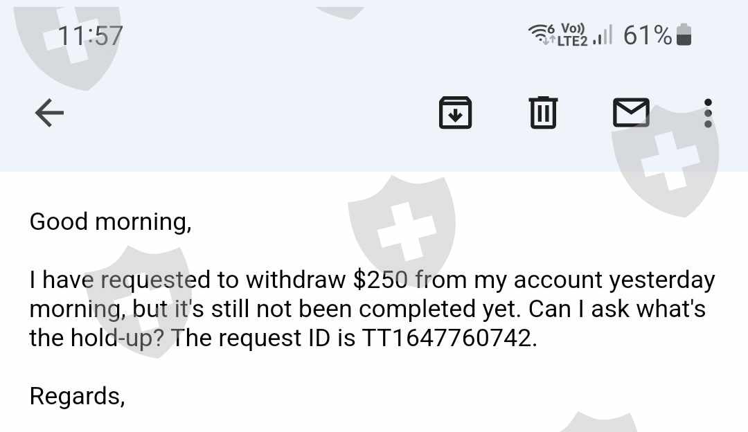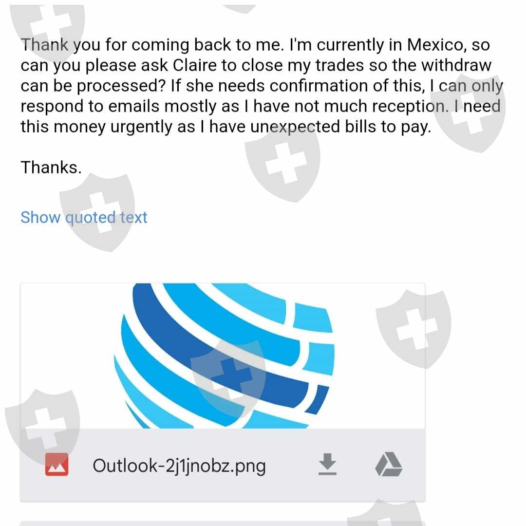 我上周在这个交易商开了一个账户。在经过初始的设置之后,我被展示了如何取款(只能在加密货币中),并且成功了。昨天我想再次出金,由于一些不可预见的情况,我收到了电子邮件说我需要和我的客户经理谈谈,因为我有未平仓交易,她需要先平仓。我有点怀疑,所以决定调查交易商,发现这很可能是一个骗局。我再次给他们发了电子邮件,要求客户经理关闭交易并将钱寄给我,但从那以后他们就不回答了。