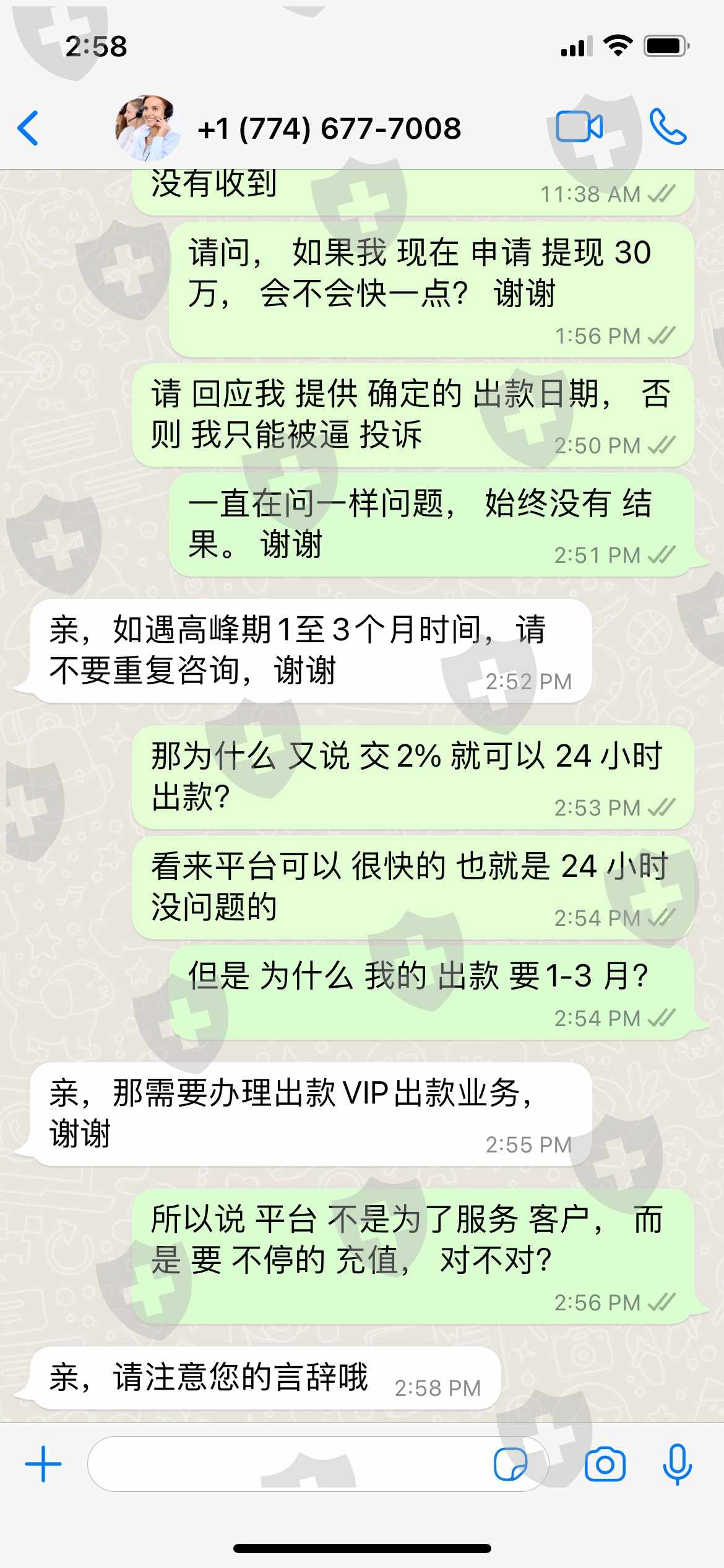 我自2021年12月起开始在RUI WIN CAPITAL交易,经过多次交易,我与平台确认提取资金。但平台表示,提款前需向平台缴纳15%的税款,税款完成后立即办理提款。我交了税又要求提款,然后他们说我之前的38万美元是别人要收的,所以我要额外支付38万美元的30%作为押金,需要在平台系统停留一周,然后返回我的账户。我把所谓的质押押金转了又要求提现,先是说提现需要1-7天,后来问了好几次才改说因为高峰期需要等1-3个月提现。同时,他们要求我支付我资金的2%成为vip,vip会员可以24小时收到提款资金。我试图与他们谈判,但他们只是无视我的信息。他们封锁了我的帐户一个月。我已经通过天眼公开了这个案例,但他们仍然没有给出任何反馈。