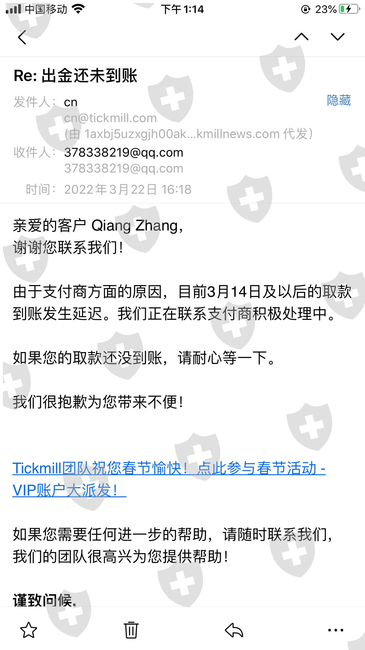 16号出金,客服称2到4个工作日到账。以后查询改为到账,客服称支付商出现问题,让我们等待。再发邮件询问具体时间,出现什么问题,就不回复