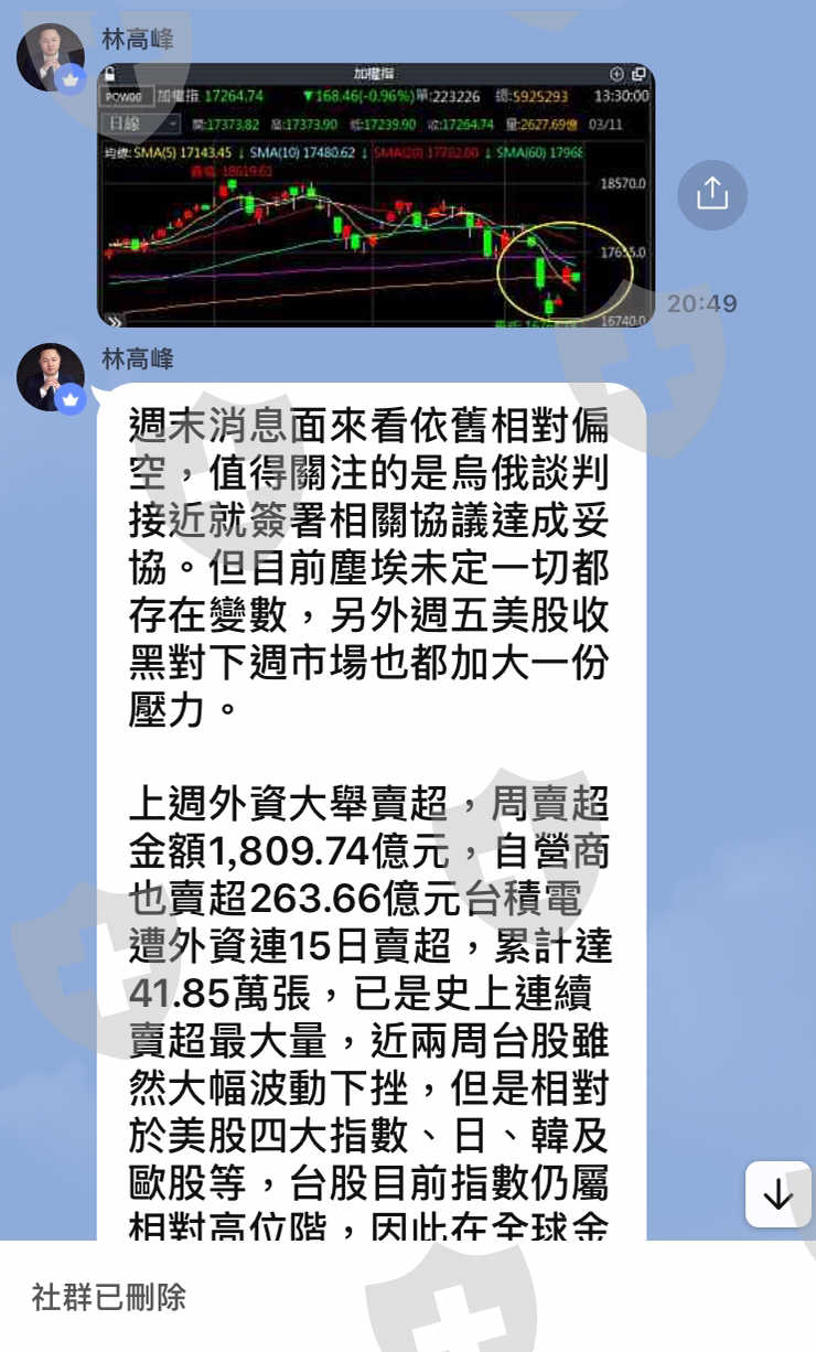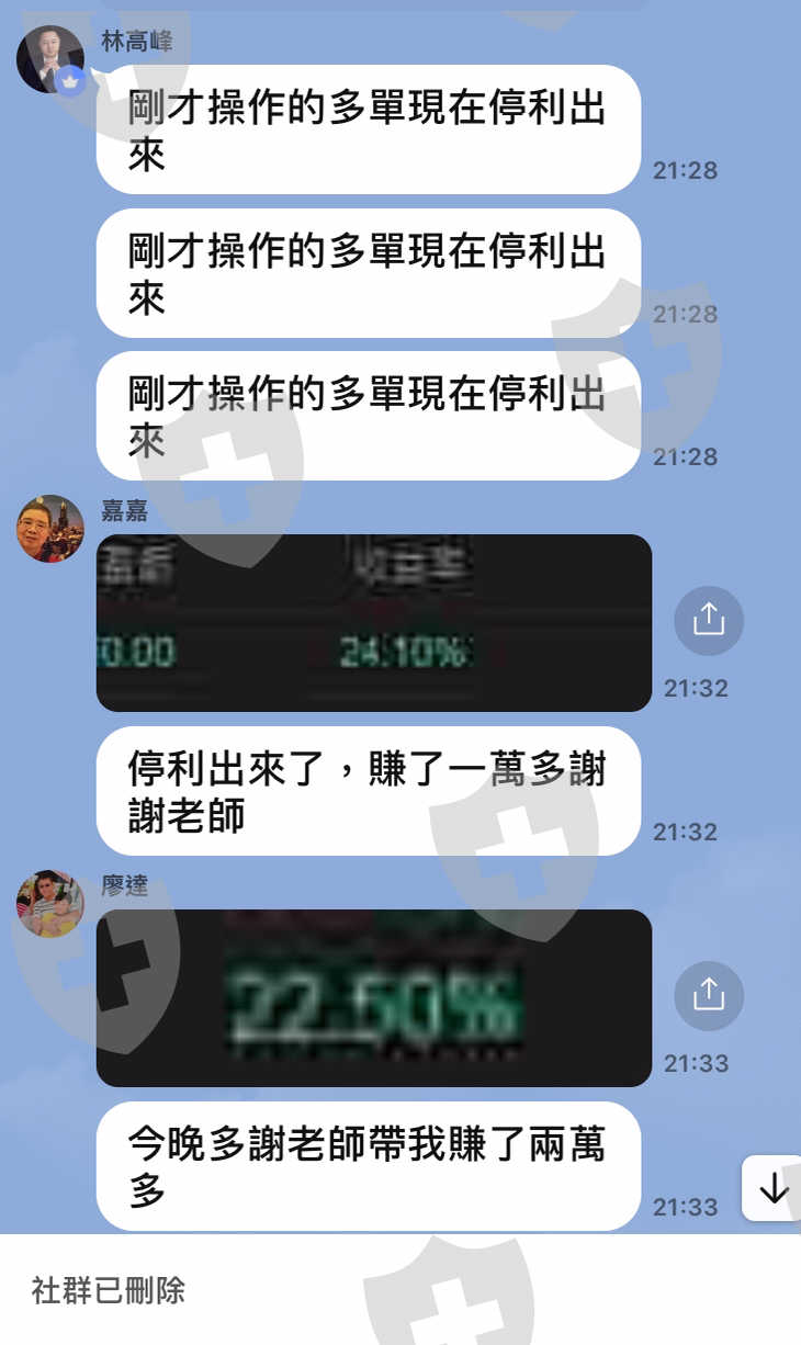 士,先帶你到股票群,每天解盤,帶幾支飆股,建立信任,再誘導至黃金實戰群,每天賺錢,鬆懈心防,老師每天勸說加碼,後來想通群組內大部份都是自己人,漲跌都是幕後作出來的,最後想出金,就把你強制退群,客服說清算部門結算好會通知你,騙人的!