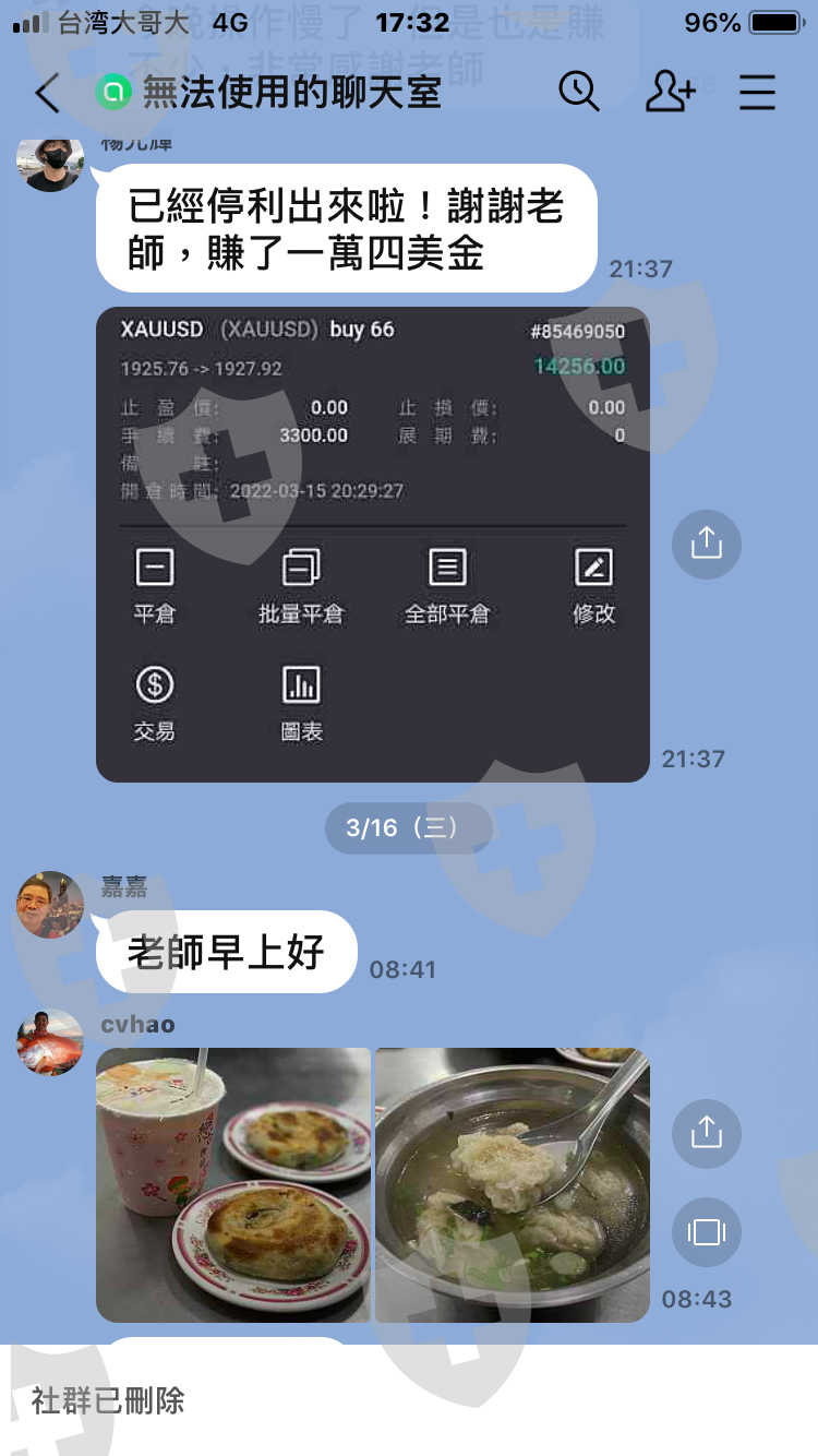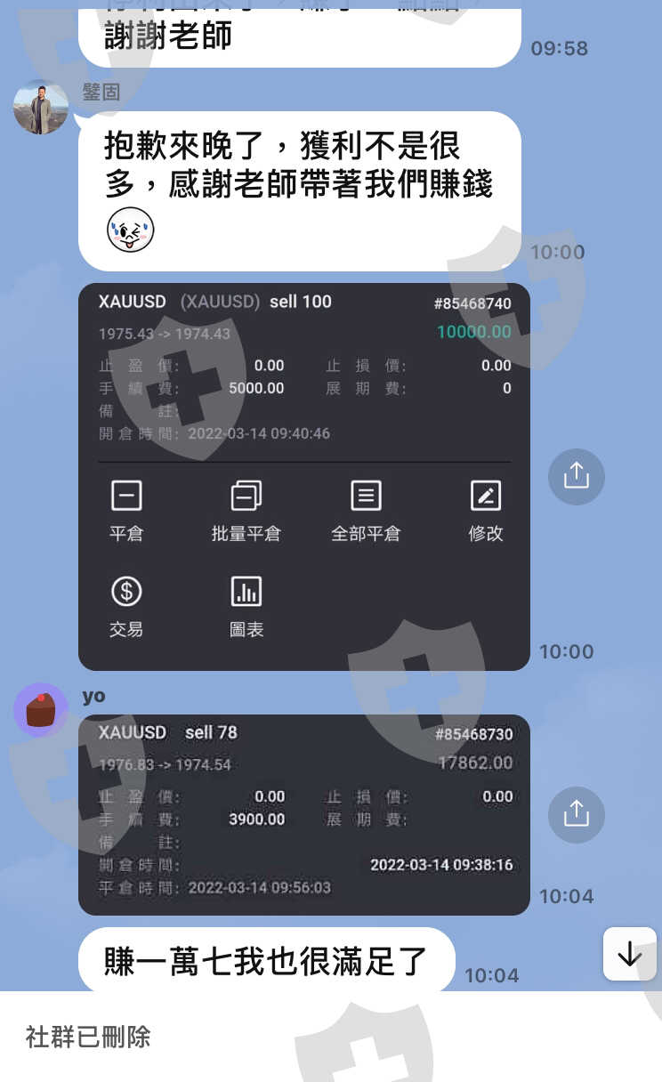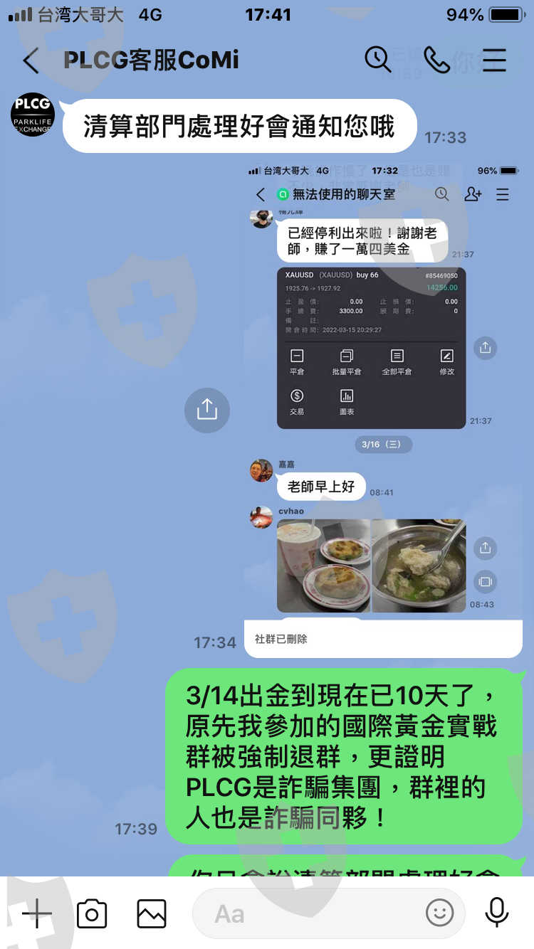 誘導先至股票群,建立信任後再加入黃金實戰群,最後無法出金,客服一直說清算部門結算後通知你,騙人的!