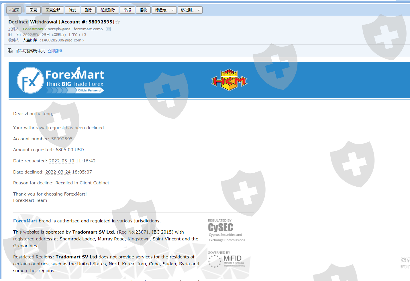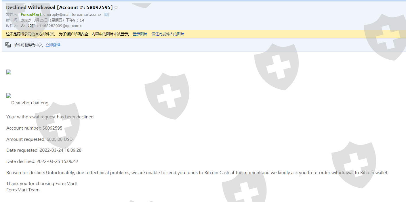 本人3月10号申请的出金一直没到账,找客服就说在处理中,到了3月25号 说是技术原因无法支付BCH,申请的出金被拒绝了 资金退回到MT4账户了,叫我用BTC出金,我入金都是用BCH入的,然后他们BTC出金要扣3%的手续费(他们官网BTC出金显示的费用是0.0002比特币+2美金手续费)这我都认了,扣了我3%的出金费用,到现在也还没到账 找客服也没用就一直在拖 敷衍客户,我只能在此曝光了,我是在你们看到这个平台信息的有监管 才开户入金做交易的,希望你们天眼平台可以帮客户协助一下出金,谢谢了。