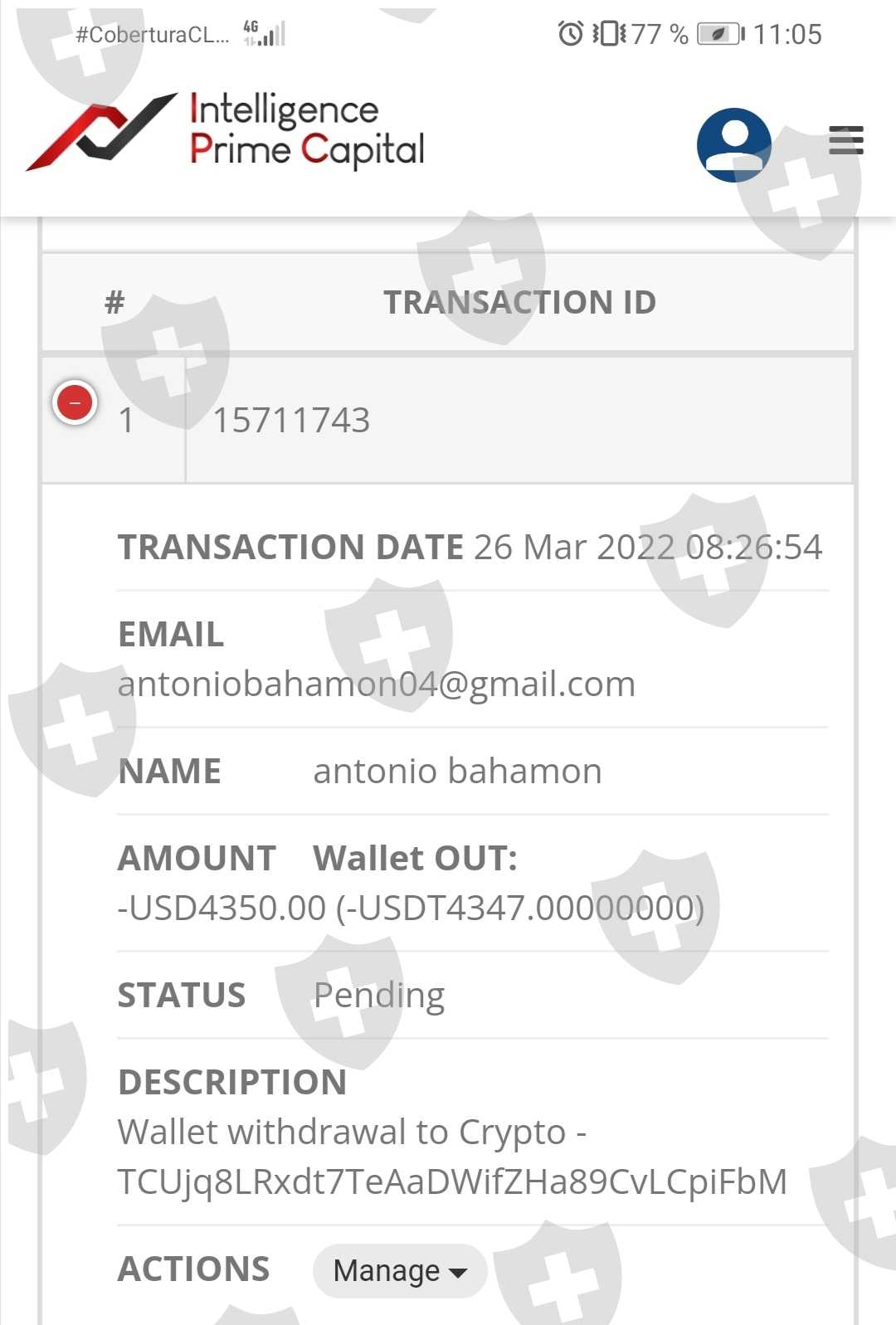 El día 26 de marzo de 2022,a las 8:26am se realiza el retiro del total del capital de 4350usd,pero aún no se ve reflejado el. Pago en mi billetera de Binance, mi correo es Antoniobahamon04@gmail.com, mi numero de cuenta del. Bróker ipcapital es: 4310724 así también hay mucha gente con el mismo problema. Agradezco su generosa gestion para que podamos hacer efectiva la denuncia y la respectiva devolución del capital de inversión.