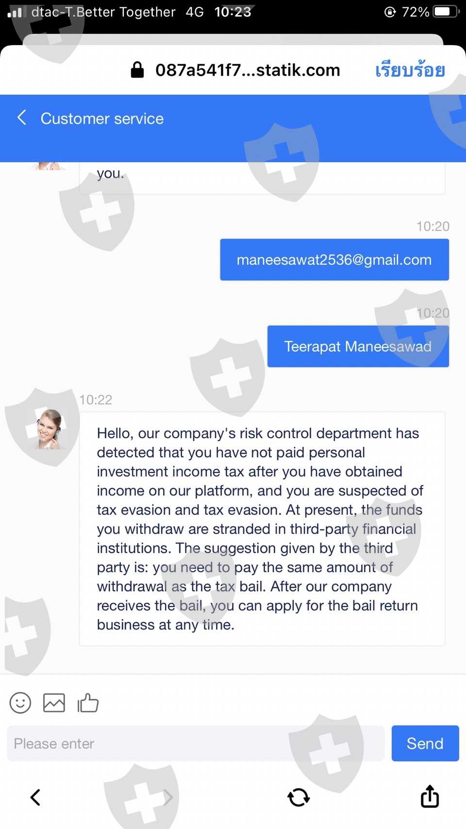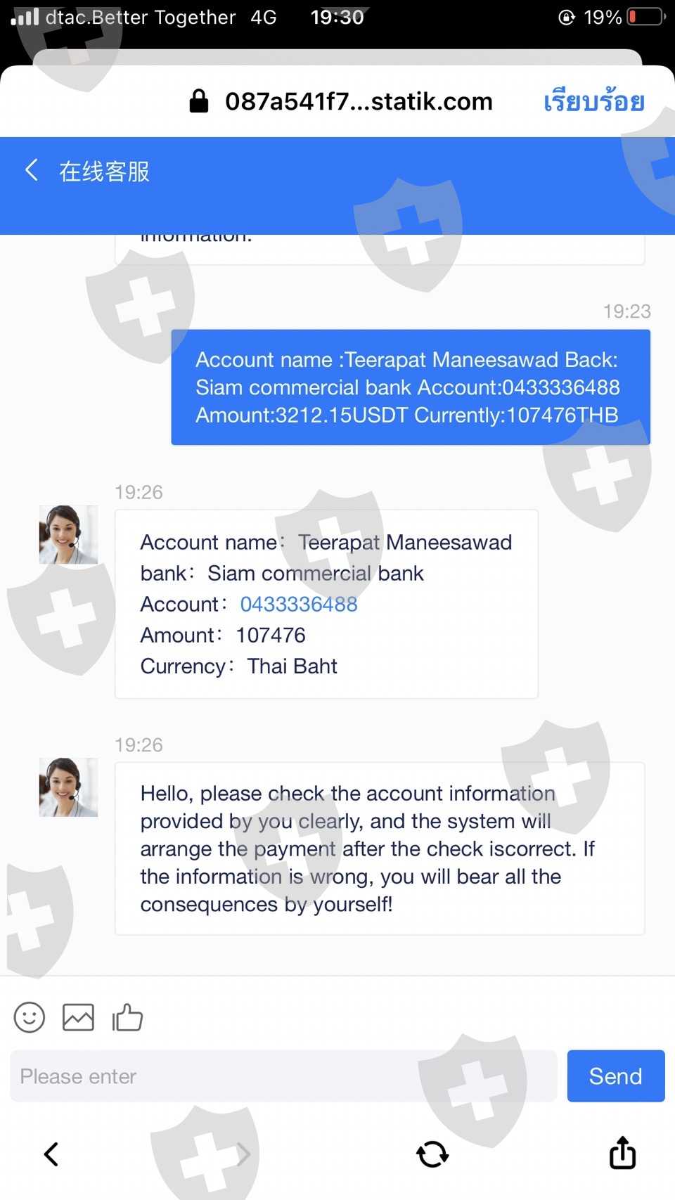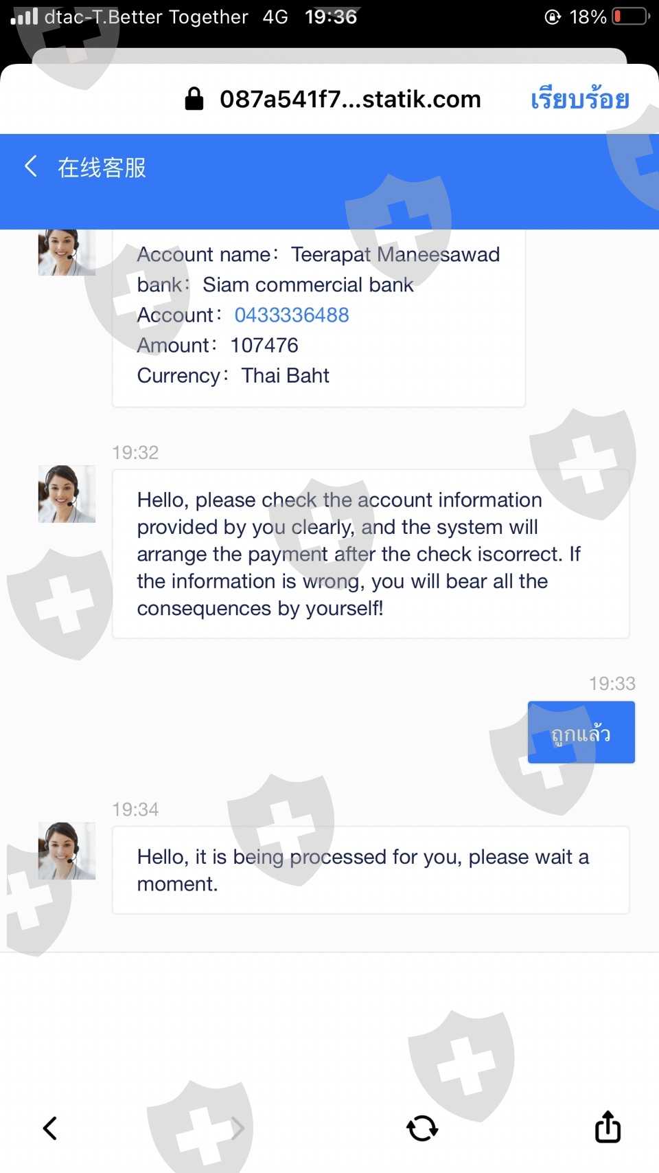 有人建议和这个经纪人一起玩。第一次转账,10万泰铢,已经交易他一拿到手镯,就想把它收回来。但不能撤回它允许您将资金转入额外的约 110000 泰铢以提取。