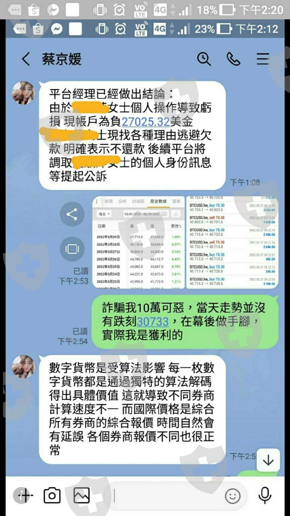 平台商後續開始追討超額虧損,並威脅恐嚇說不給錢就要訴諸法律,各種惡毒語言盡出。完全不承認造假報價的過程,硬要說這是正常滑價(從44000滑到30000?)。請大家注意這家平台商。