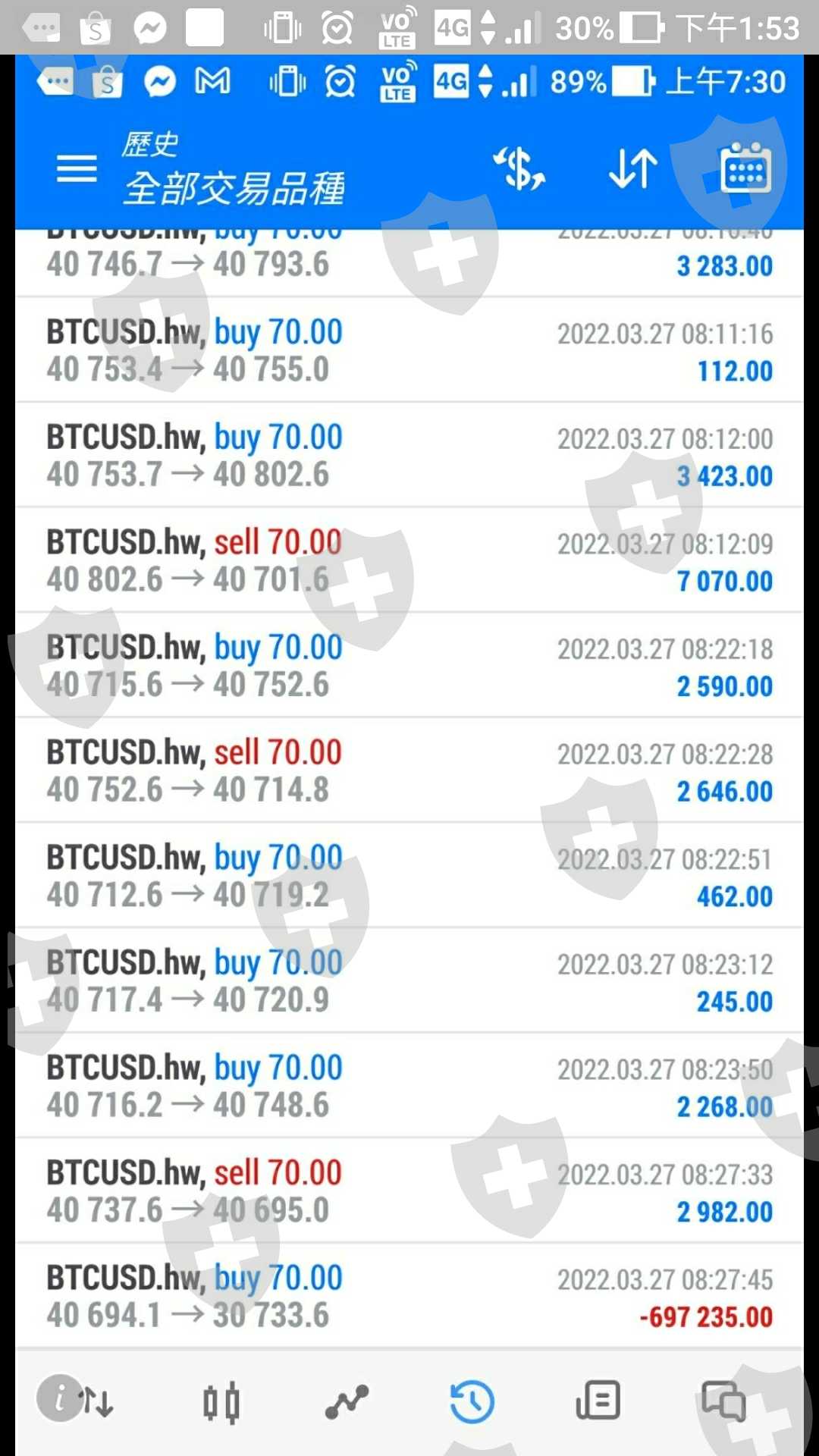 此平台提供比特幣交易,在3/27這天比特幣報價突然下殺到30000,瞬間再拉回44000。導致我交易的比特幣多單瞬間爆倉並超額虧損兩萬美金(我原本入金3000美金左右),原本的獲利全數回吐並且超額虧損。後續查了各家虛擬貨幣報價,3/27這天根本沒有30000這種價格,甚至3/27比特幣還是大漲。