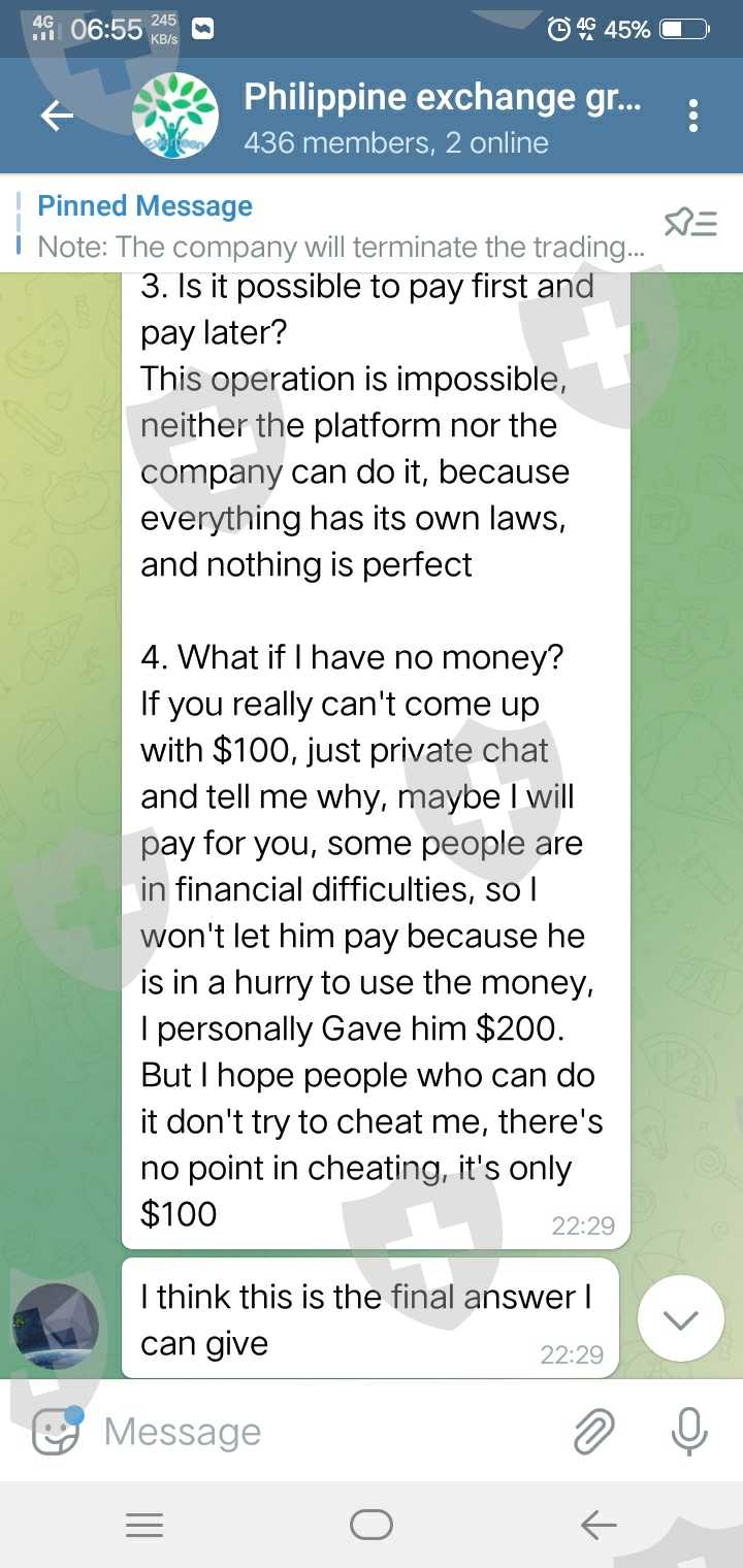 我只是想曝光一下静小姐是个什么样的女孩,我不知道她的真名。但我只知道她在我国有一个男朋友。Lite Shipping Corp.的Capt.Lebiste在宿务市,菲律宾。他们说外汇交易不是骗局。我们信任Jing。因为我们知道有情侣。但是在3月31日退出后突然Jing联系不上,甚至他的男朋友也联系不到他。所以,什么我们做到了?我们认为这是一个骗局,尽管它很痛苦,但我们无事可做,因为这是事实。从现在开始,我想要的只是退款和退款。全部花费 1073.88 美元。我很失望他们对我们做了什么。请女士/先生帮我退还我的钱。帮助我们!这是给妈妈做肝脏手术的钱