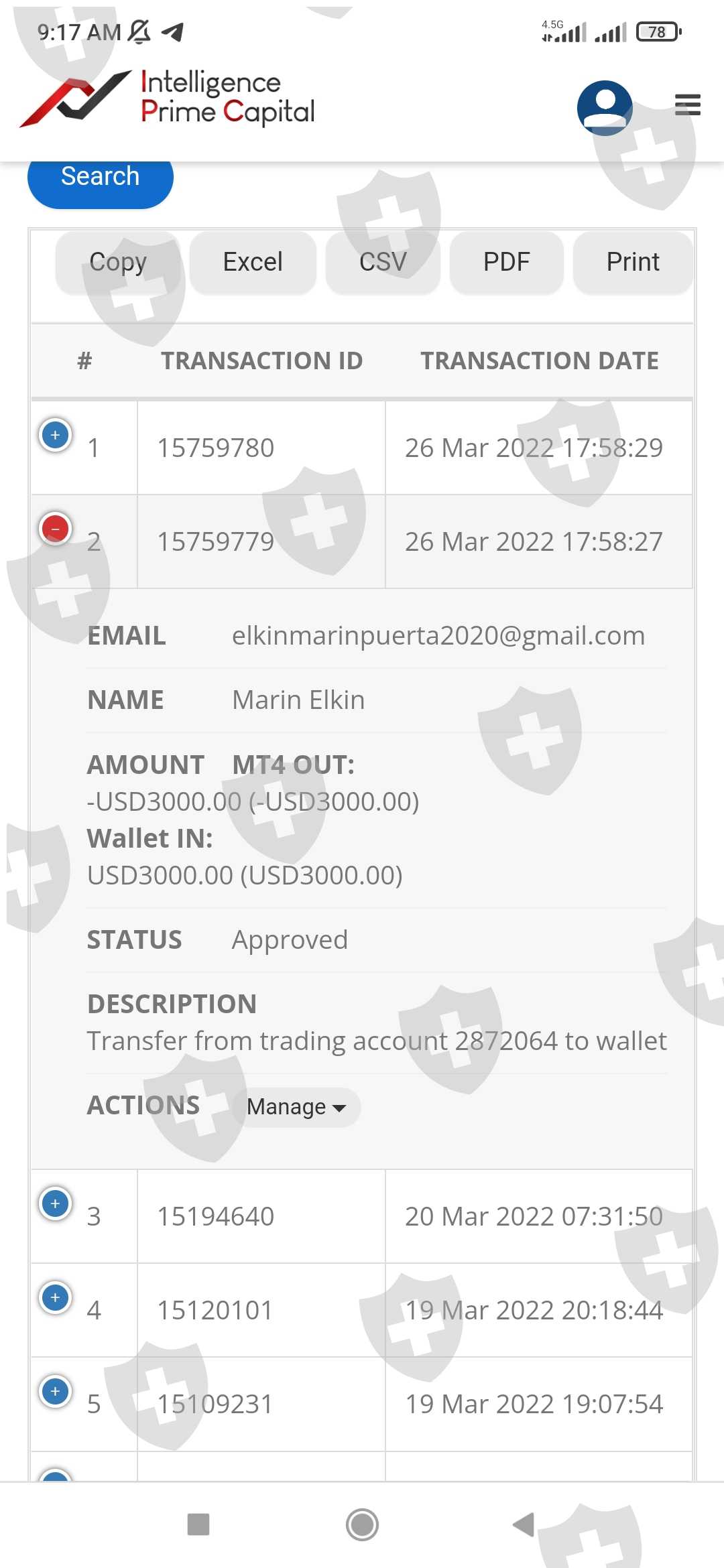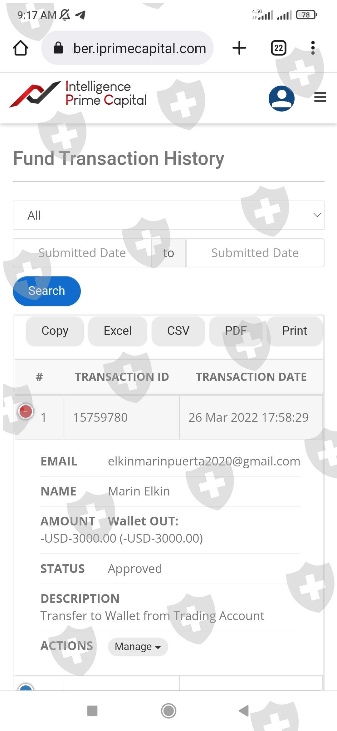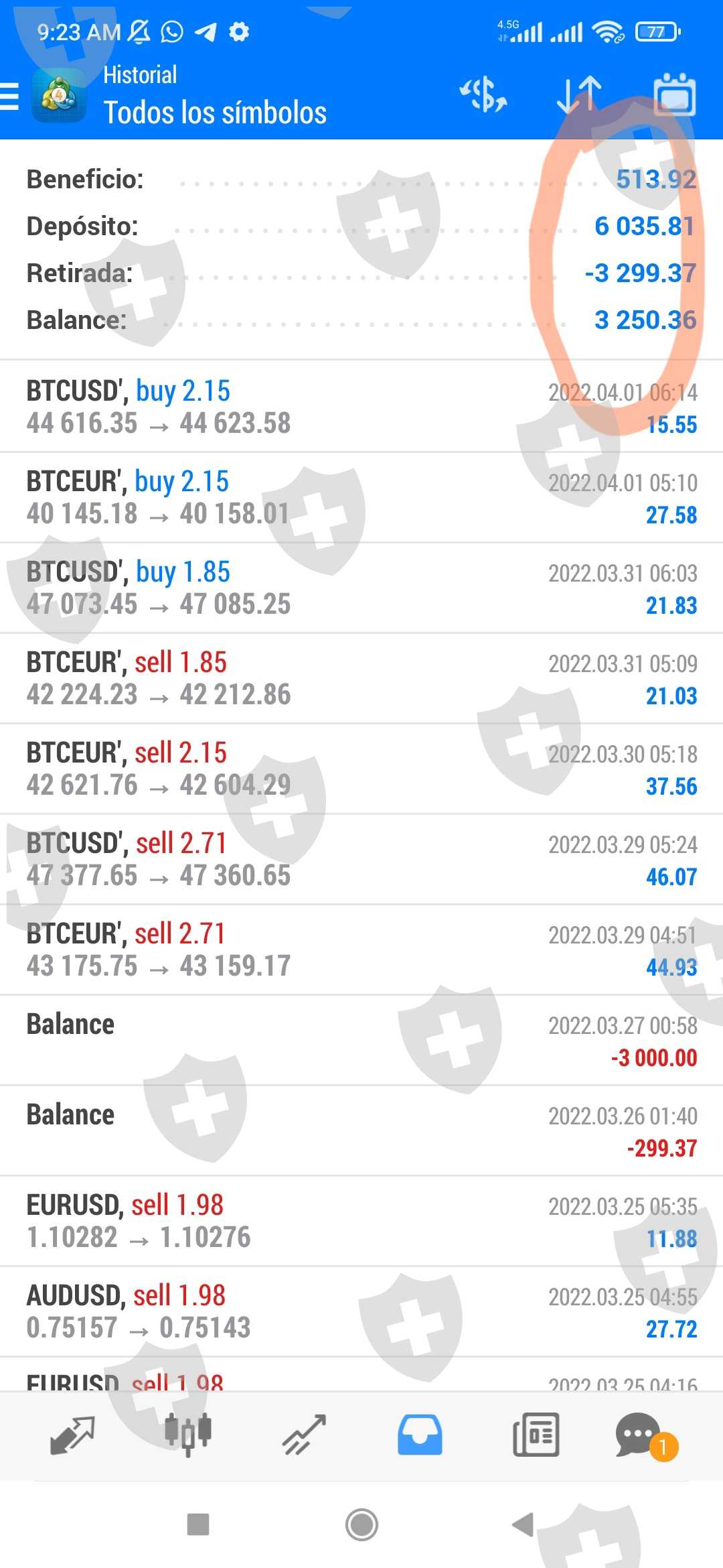 26 de marzo de 2022 transferí 3000 USD desde la billetera de mt4 a la wallet interna para poder retirarlos, sin embargo ese mismo día el broker lo retira de la wallet interna supuestamente para trabajarlos pero no sé dónde se encuentra actualmente ese dinero. todo se encuentra en ceros. Tengo retenidos en el broker 6035 USD en total. Espero una pronta respuesta por parte de ustedes y una pronta solución. muchas gracias y adjunto pantallazos como evidencia.