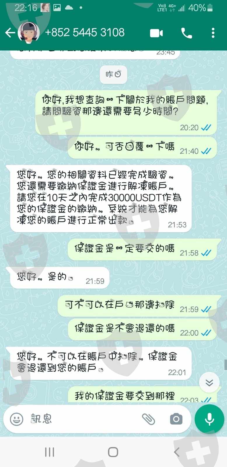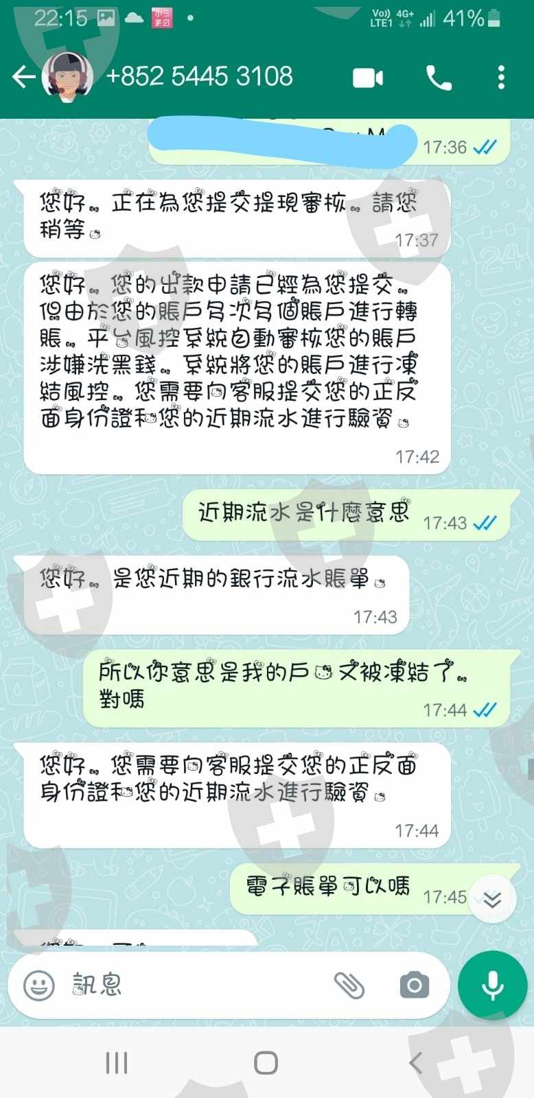 早前在WHATS APP上認識了一個朋友,不久之後他說帶我進行MT5外匯交易,並用了SHENGHUI外匯平台進行交易。開始時確實能入金出金。後來,我朋友說叫我和他一起參加一個活動,需要投入20萬美金,我便用了自己的存款和借貸了一點來注入賬戶中。當活動完成後,我想出金,結果客服說「你的賬戶多次多個賬戶進行轉賬,平台風控系統自動審核您的賬戶涉嫌洗黑錢,系統將您的賬戶進行凍結風控,您需要向客服提交您的正反面身份證和您的近期流水進行驗資。」於是我把文件都交了。一天後,他們的客服通知我說要交30萬保證金才可解凍賬戶出金。我感覺被騙了,就連這個朋友也感覺好像合伙一齊騙我一樣,不停叫我入金到賬戶,也幫我把信用卡的錢轉換入賬戶。我覺得我就算交了也是不會出金的,還要十天內,不然戶口永久凍結或是要交3倍的保證金。我現在只是想拿回我賬戶的20多萬美金。希望能幫我調解。整件事情都是發生在這一個月。
