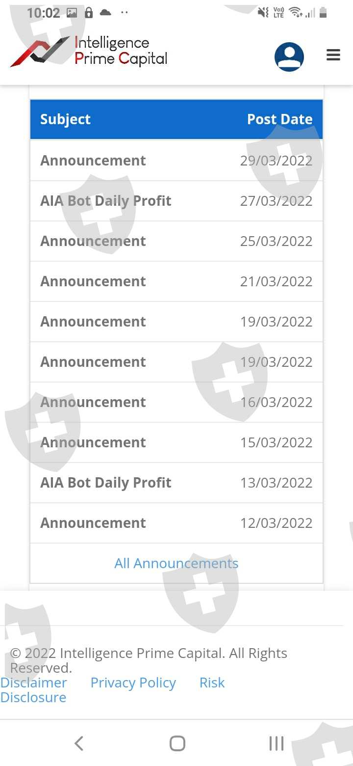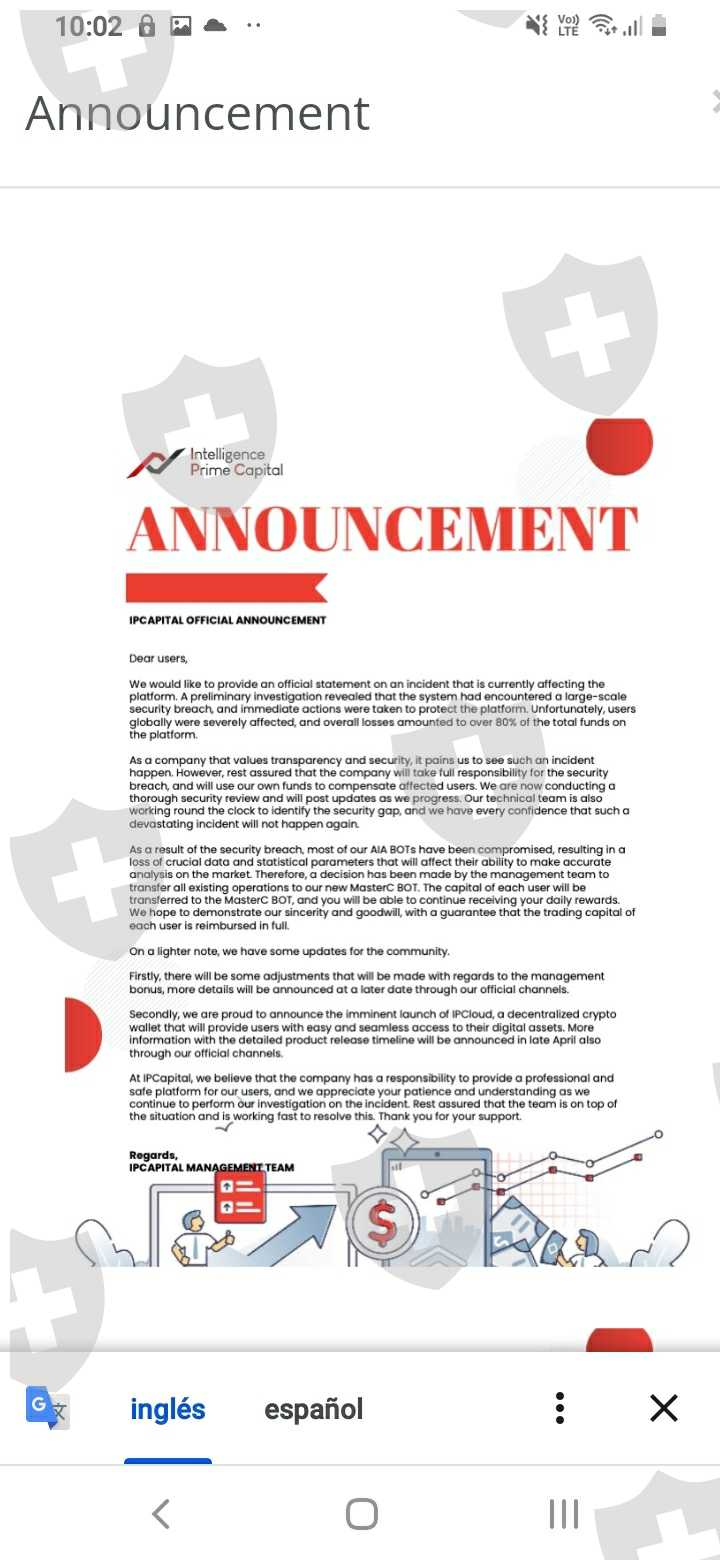 Buenos días le saluda Cliff Villalobos inversor de intelligence prime capital con cuenta número 2889130. las cueles la empresa intelligence prime capital no está cumpliendo no esta pagando desde el 19 de marzo. Aduciendo muchas actualizaciones de la plataforma con muchas escusas de problemas que a nosotros no nos compete. y por último el 29 de marzo nos dijeron que fueron víctimas de haqueo de los cuales solo son comunicados pero sin ningún sustento válido. acudo a ustedes para que la empresa pueda regularizar o en todo caso se pronuncie al respecto como será denuestro capital invertido. y no estar expuesto a un exposición de fraude inducido. y estar seguros que nuestros capitales están en empresas reguladas. optube su servicios para un robot de forex de las cuales nos cambiaron las condiciones y nos pasaron a otro robot y pretenden congelar las cuentas por 100 días sin previo aviso las cuales no estoy de acuerdo.