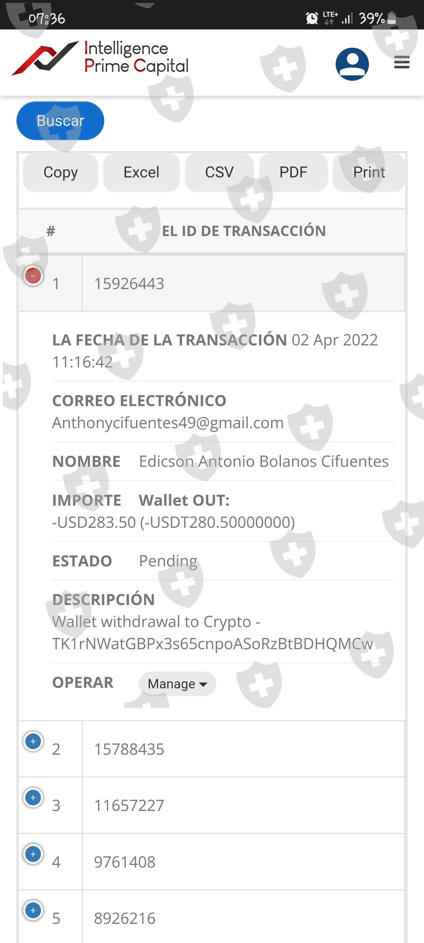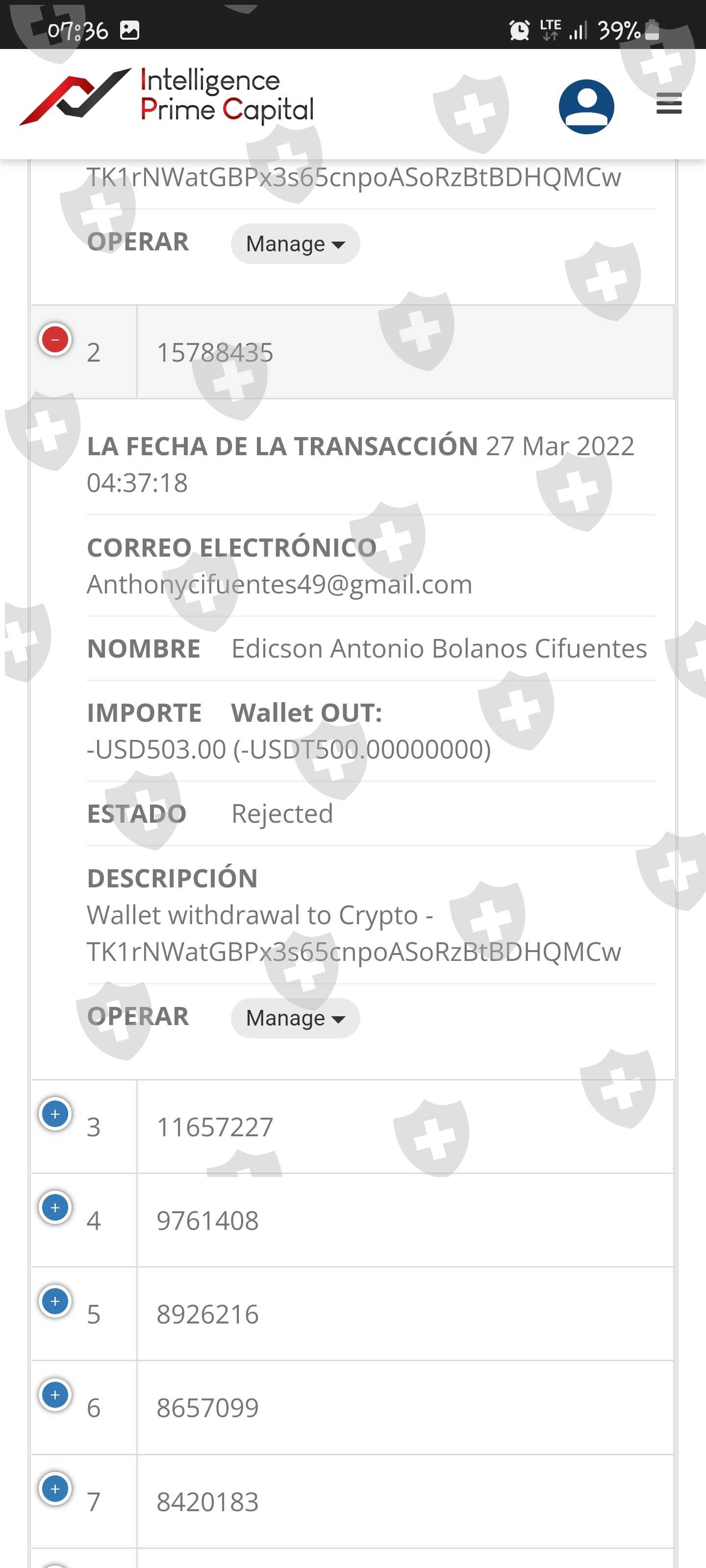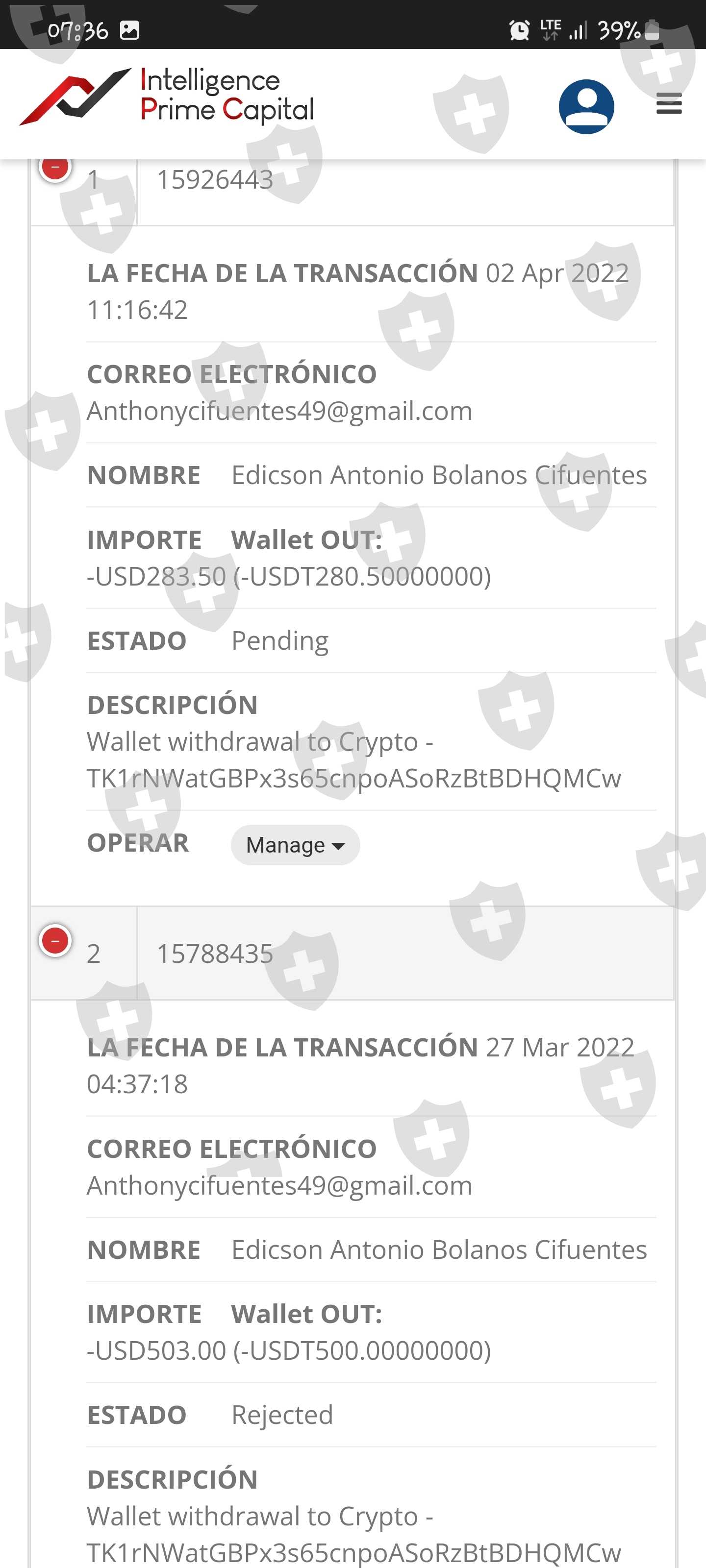 我进行了两次取款,一次为 500 美元,另一次为 280 美元,到目前为止,我的虚拟钱包中没有任何反映。我要求退还这笔钱,因为经纪人在 15 天前停止工作......