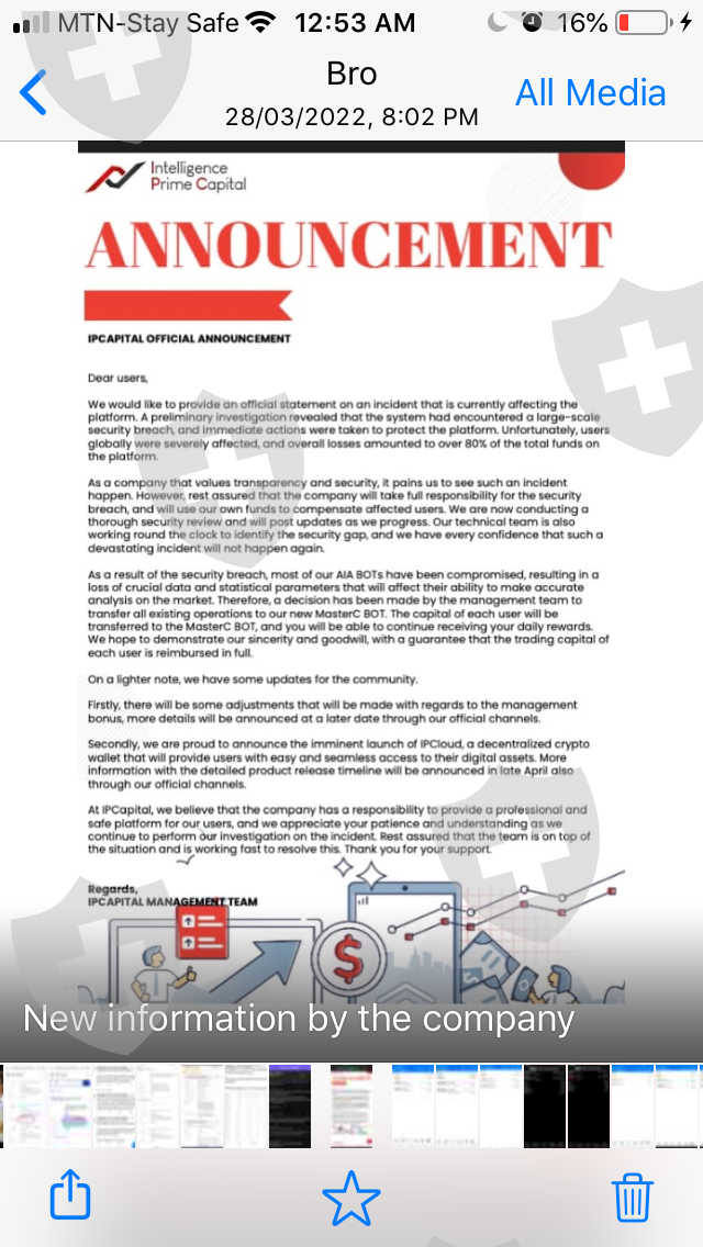 No one in IPRIME capital has been able to withdraw either their weekly profits or Mt4 trading capital for 3weeks now. It all started when the management sacked their market staffs and that week end we were not paid our profit splits our usdt wallet was not credited . For 3weeks now we don’t get our profits. it does t even appear on our Mt4 Wallets it just disappears. ipc assures is everything was fine 2.5weeks ago that there was. security breach so they lot 80% of funds and they wld rectify the issues with their money ..and also that they were working on ipcloud to solver all pending withdrawal and profits splits but we are yet to see any changes . that also forced all of us to subscribe for the new bot master c bot claiming the others has been compromised . Now we can withdraw our capital or profits . pls help us get our money back profits and capital