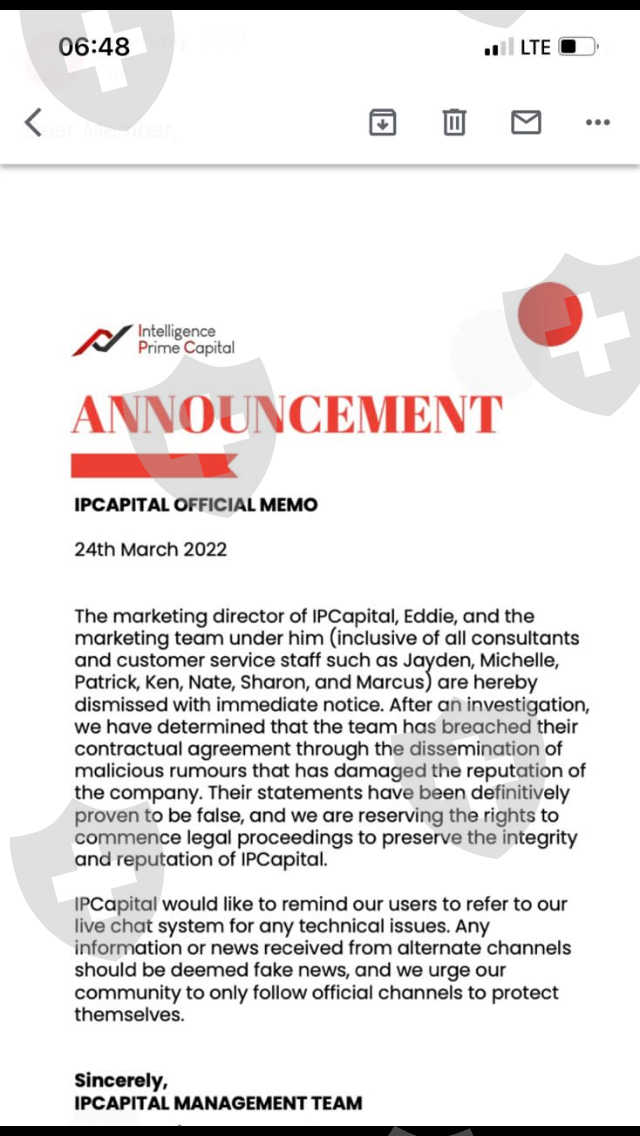 IPRIME CAPITAL中没有人能够提取他们三周内的每周利润或Mt4交易成本。这一切都始于管理层解雇了他们的市场工作人员,而那个周末我们没有收到我们的利润分成,我们的美元钱包没有记入贷方。 3 周以来,我们没有获得利润。它甚至没有出现在我们的 Mt4 钱包上,它只是消失了。 IPC保证2.5周前一切正常。因为安全漏洞,所以他们失去了80%的资金,他们会用他们的钱来解决问题。而且他们正在使用ipcloud来解决所有未决的提款和利润分配问题,但我们还没有看到任何变化。这也迫使我们所有人订阅新的 bot master c bot,声称其他人已被入侵。现在我们可以提取我们的资本或利润。请帮助我们取回我们的钱,利润和资本