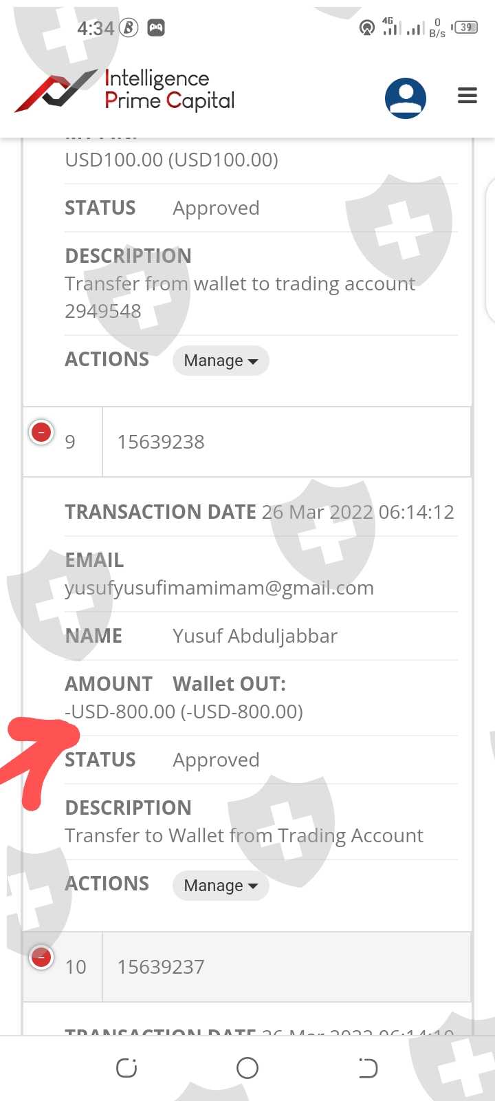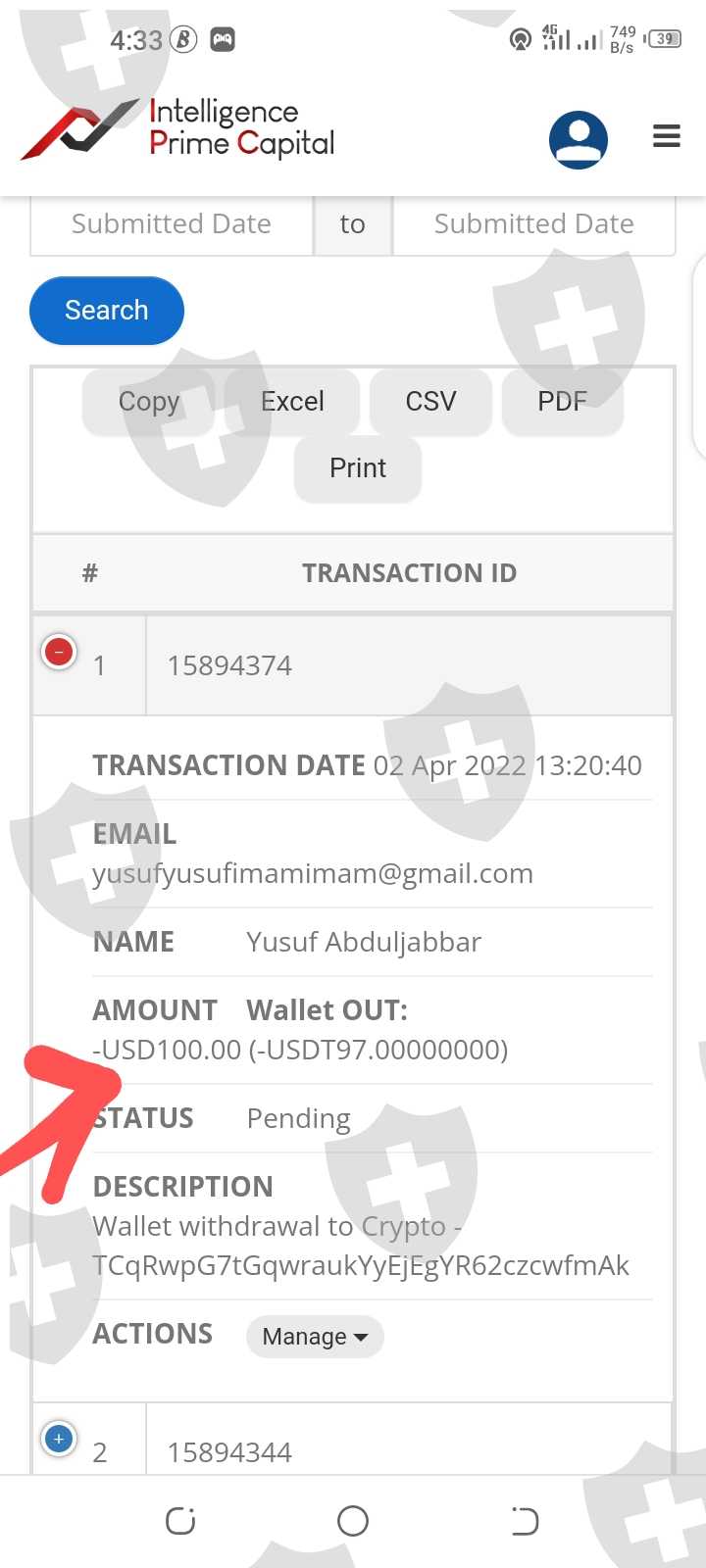 我自2022年3月26日起无法在IPCAPITAL交易商提取我的资金 。我的账户中有1000美元。细分如下: 1. 我USDT钱包中的800美元自2022年3月26日起消失了 2. 我mt4交易资金中有200美元 3. 自2022年4月2日起等待提款的有100美元。而且我在过去两周内没有收到我的利润。2022年3月26日和2022年4月2日,分别为50美元和27美元。我需要你的帮助来帮助我取回我的资金。谢谢 abduljabbar yusuf 08136862053 yusufyusufimamimam@gmail.com