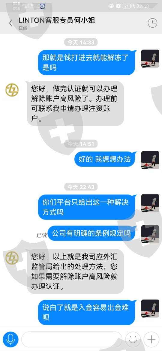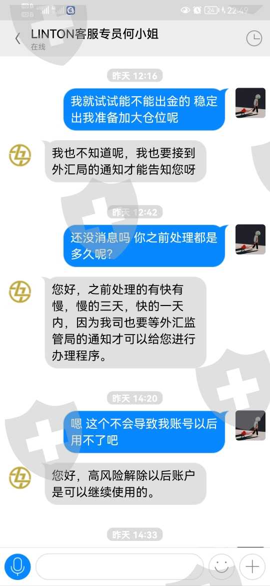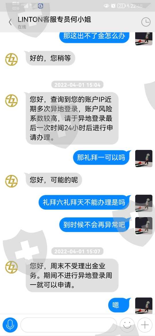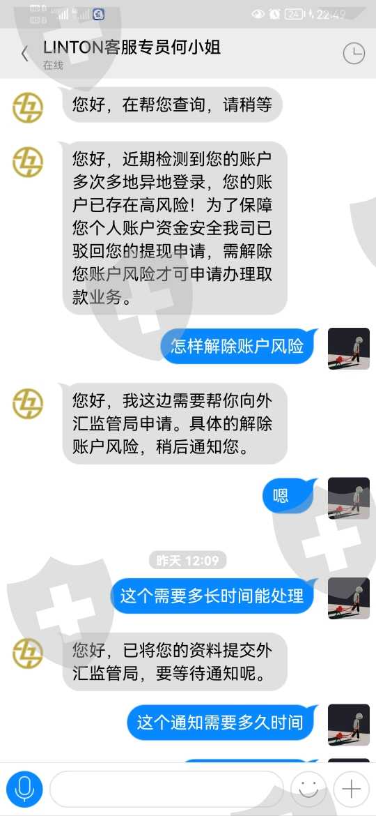 4.1号出金提示账户ip地址登录异常24小时后再申请 联系客服说期间不再异地登录4号就能正常办理 4号申请出金又提示账户高风险 联系客服说解除高风险要等外汇局通知 5号给的通知就是要注资10000美元解冻
