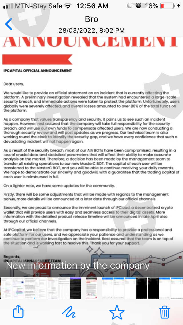 大家认购的iprime capital现在已经3周无法出金了。首先,我们得到了一个通知,他们解雇了所有的管理团队。然后他们没有把我们的利润存入我们的美元钱包,从那以后。我们的钱包没有任何利润,现在已经3周没有提款了,先生,我们所听到的只是他们在 ipcloud 上工作。机器人仍在交易,但我们不会看到利润减少或退出